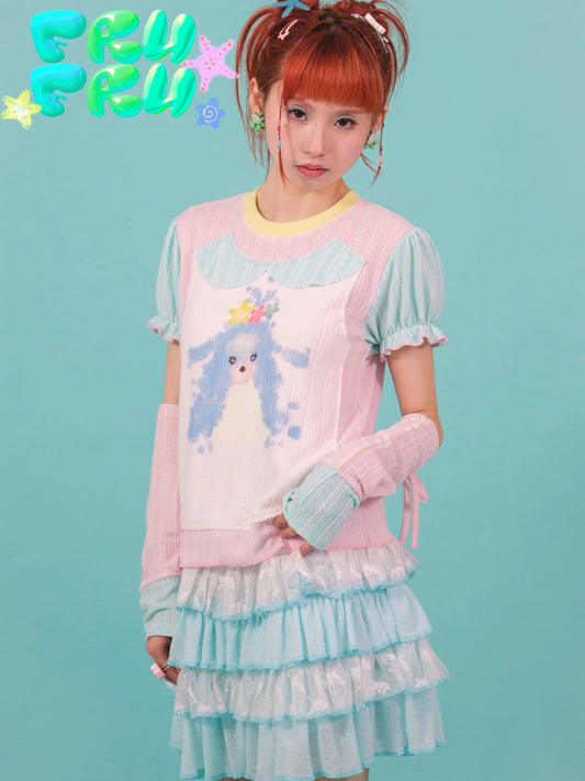 Ballet Mesh Layered Low-Waist Tie-Up Ruffled Skirt & Off-Shoulder Print Short Sleeve T-Shirt NA6977