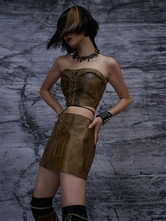 Washed PU Leather Tube Top & Zipper Studs A-Line Short Skirt & Leg Covers Setup NA8174