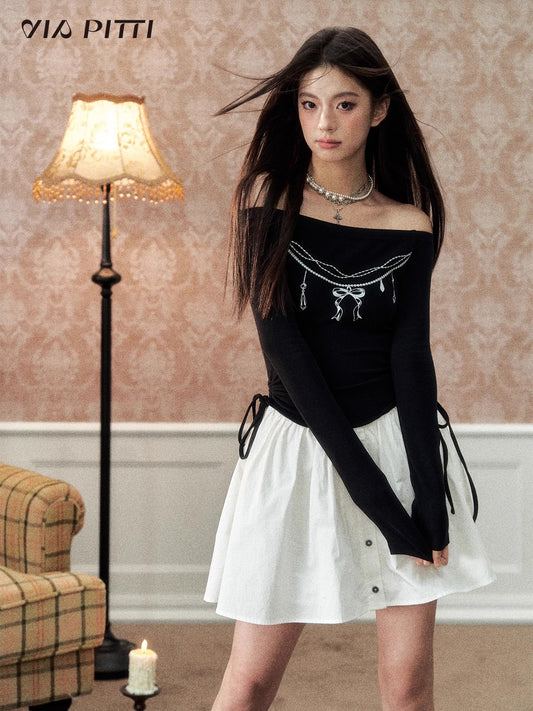 Off Shoulder Pearl Necklace Print Patchwork Dress NA5062