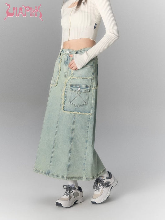 Washed Large Pocket Denim Long Skirt NA5039