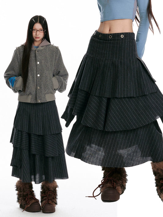 Textured Asymmetrical Striped Midi Ruffle Skirt NA7093