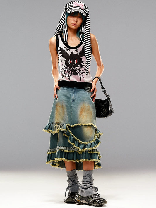 Raw Hem Ruffle Mud-Dye Denim Skirt NA6671