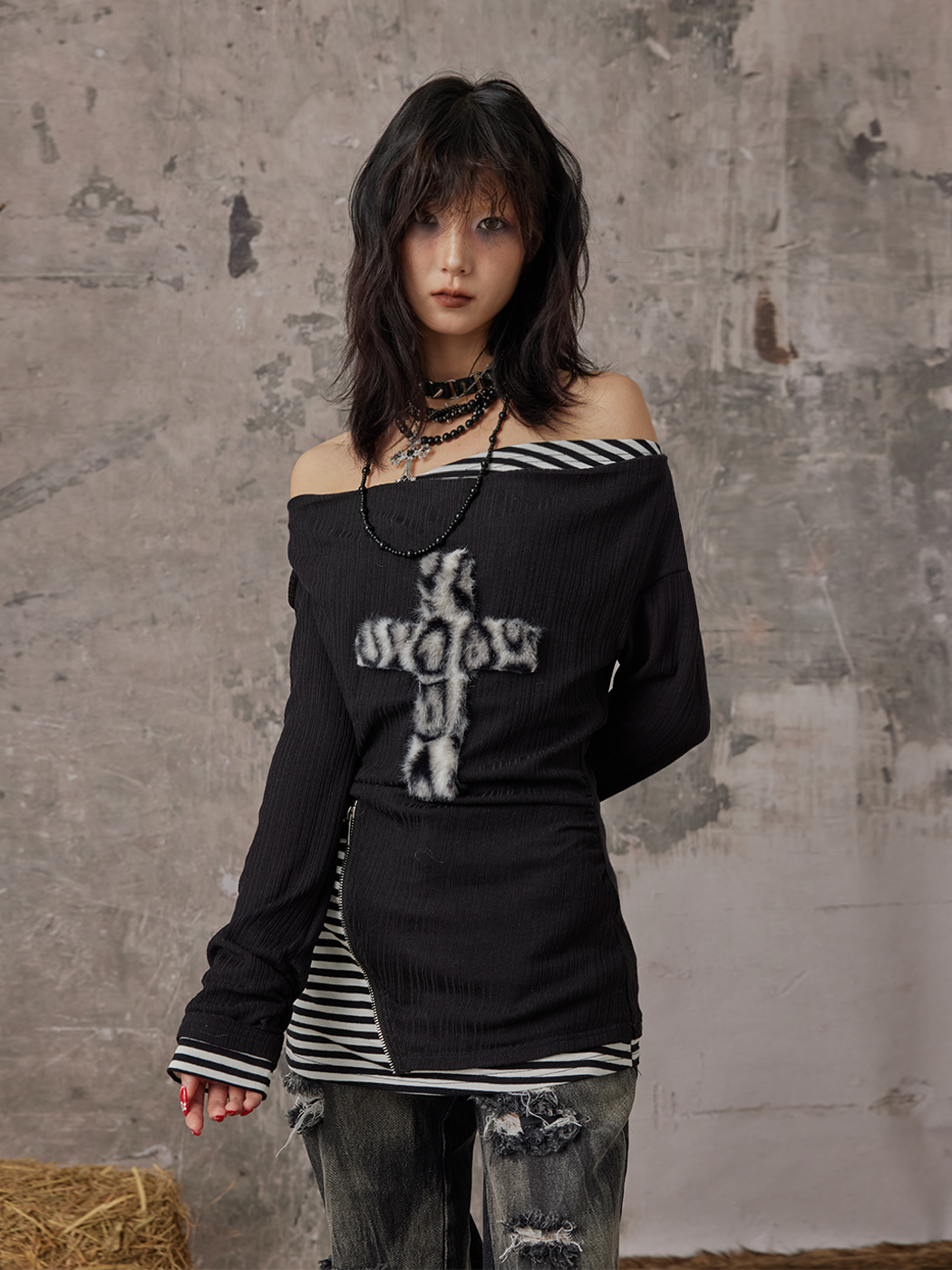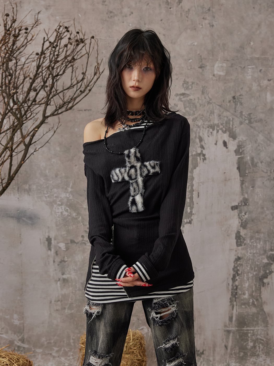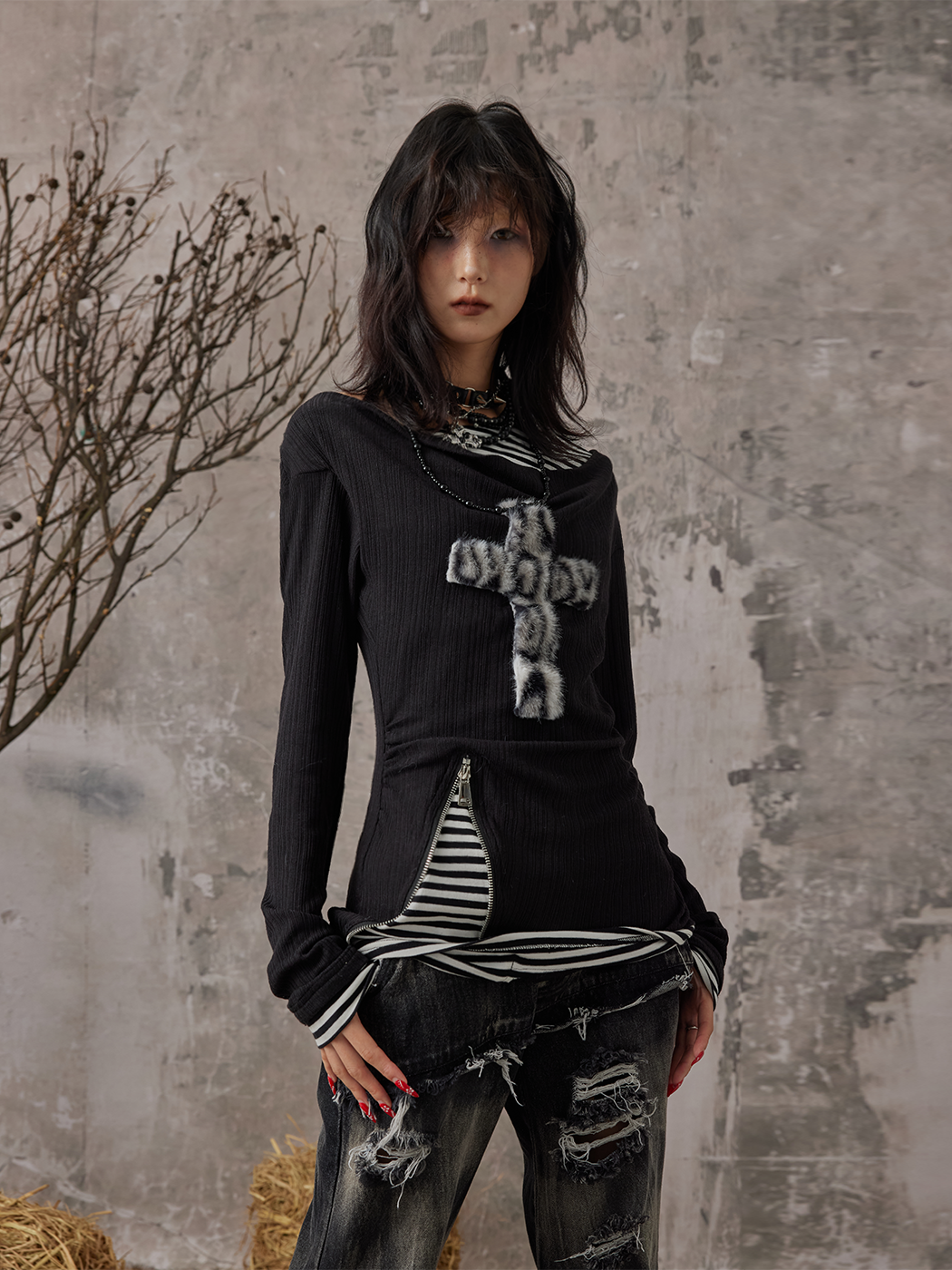 Leopard Fuzzy Cross Fake Layered Draped Stripe Long Sleeve Knit Sweater NA8166