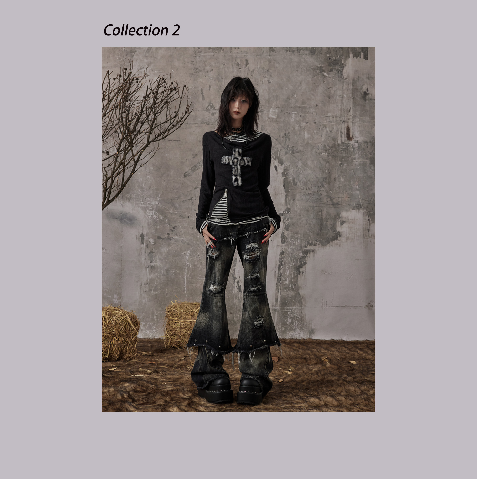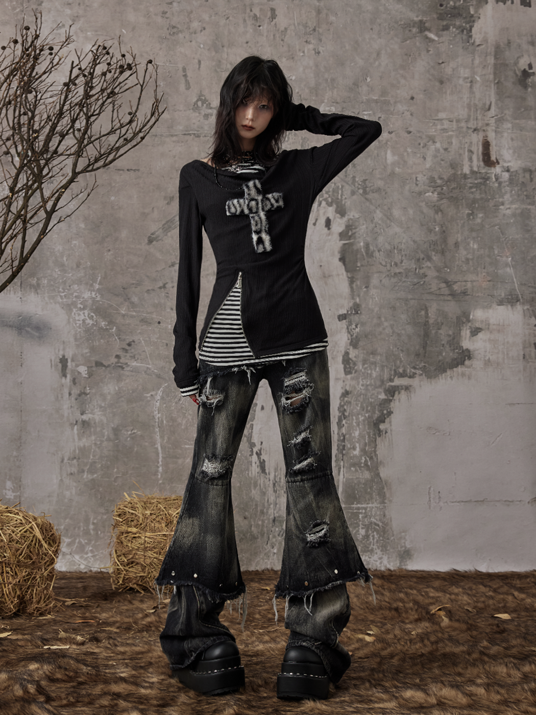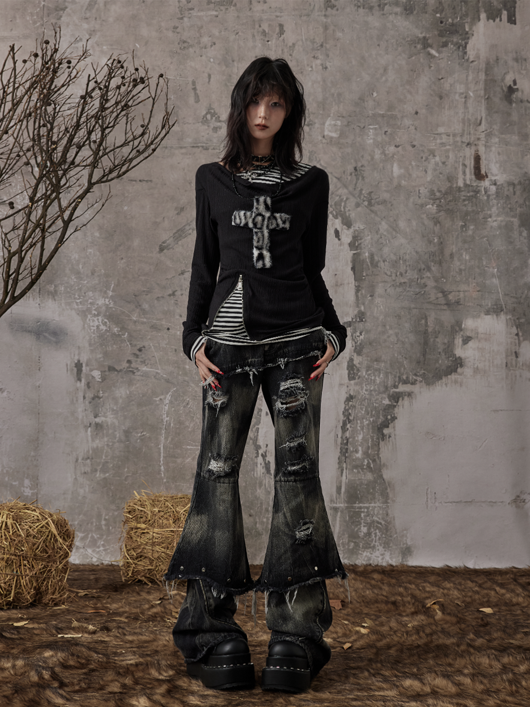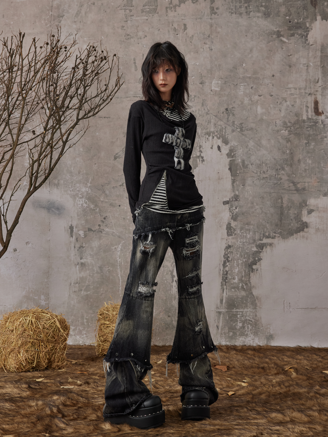 Leopard Fuzzy Cross Fake Layered Draped Stripe Long Sleeve Knit Sweater NA8166