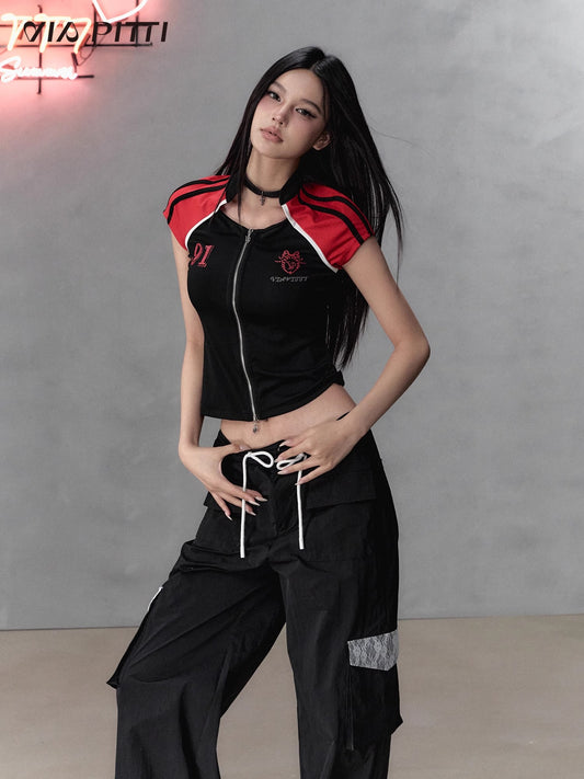 Sporty Contrast Color Zipper Short Sleeve T-shirt NA4964