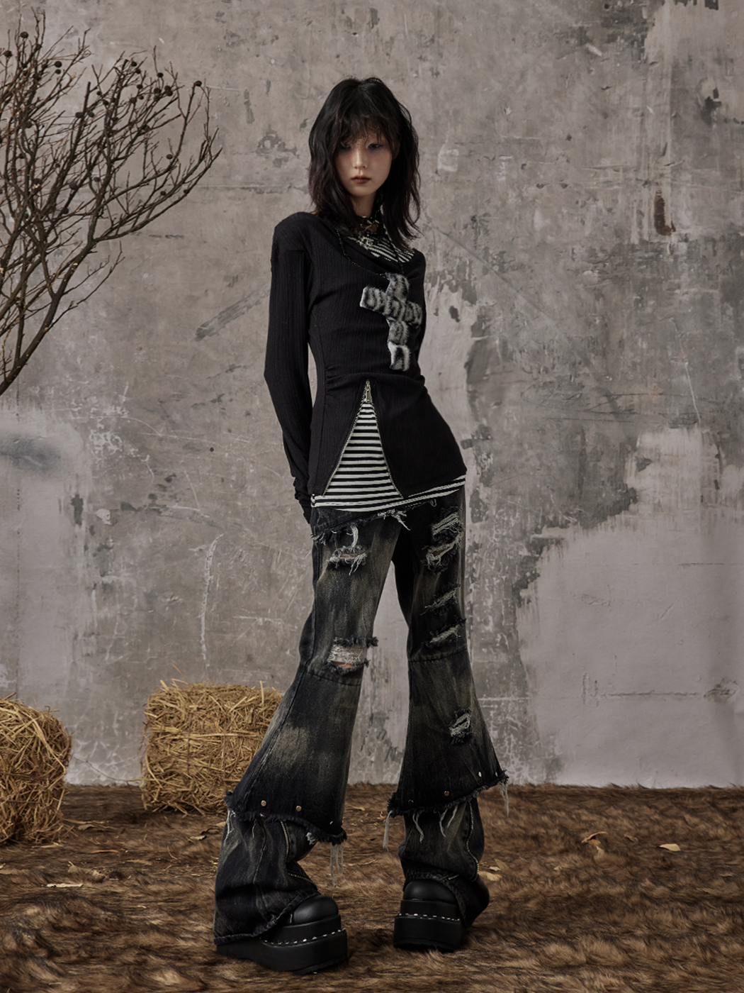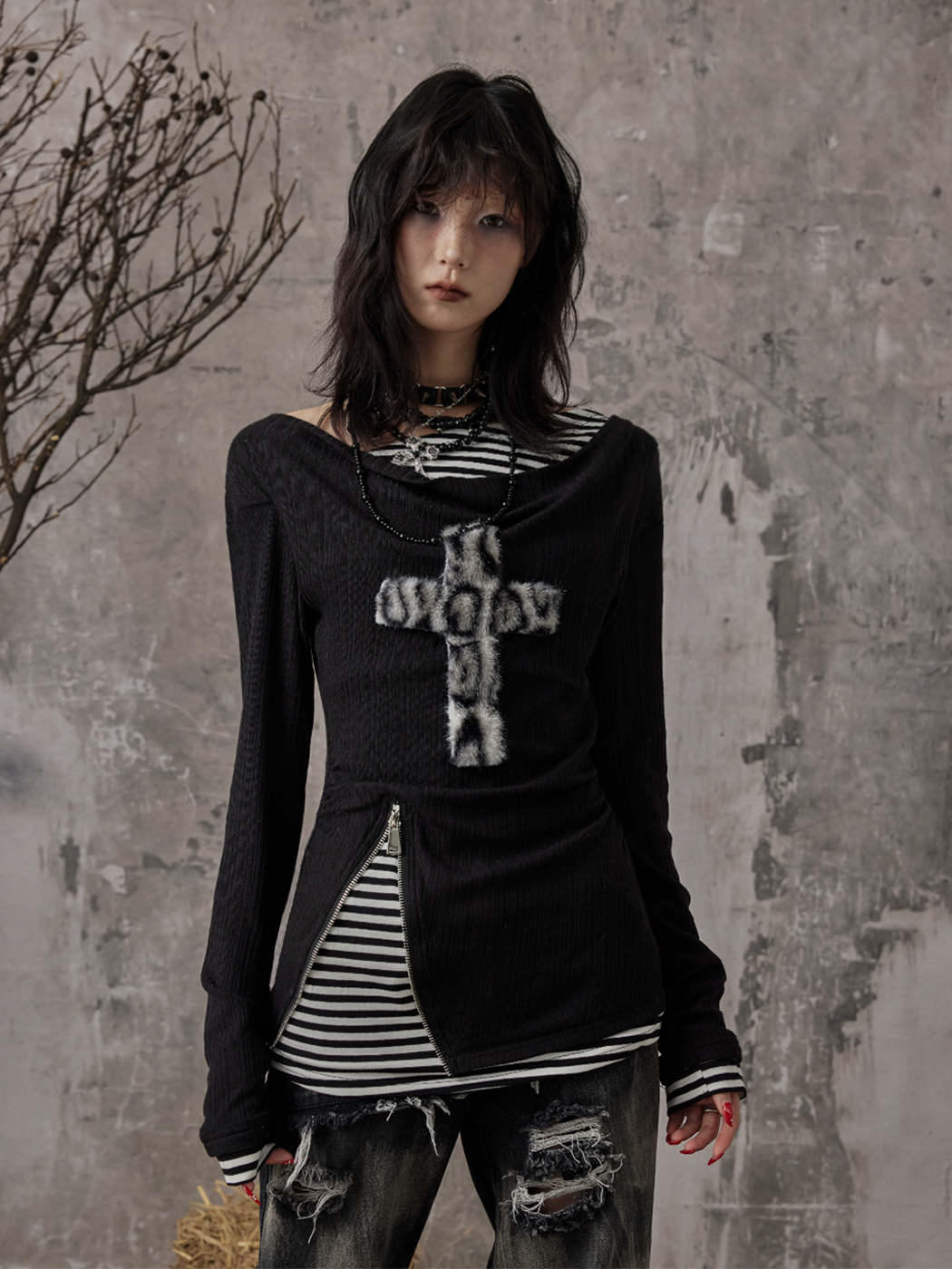 Leopard Fuzzy Cross Fake Layered Draped Stripe Long Sleeve Knit Sweater NA8166