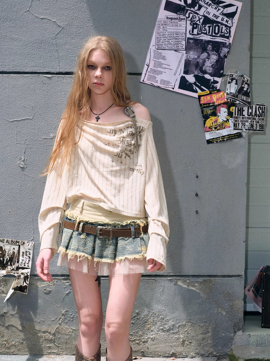 Graffiti Design Slanted Shoulder Long Sleeve T-shirt NA6029