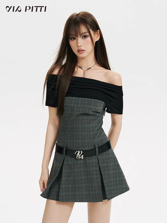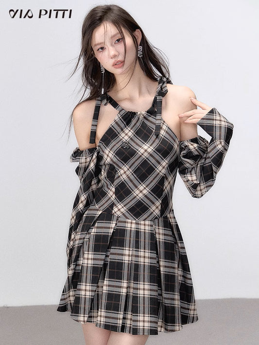 Shoulder Cut Plaid A-line Pleated Dress NA4916