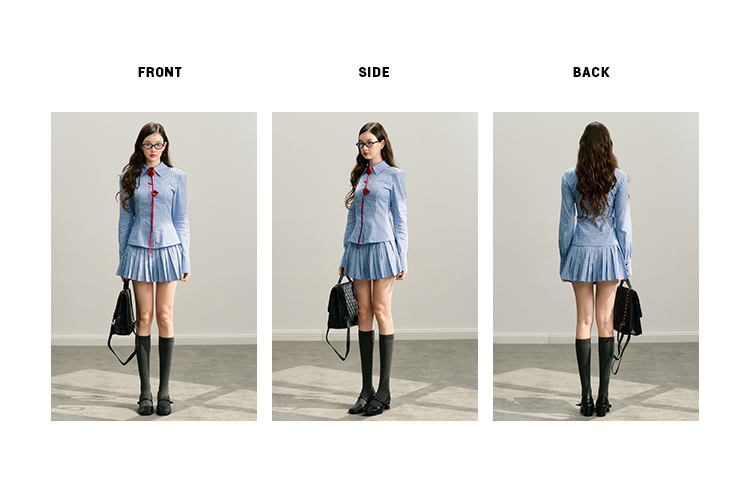 Handmade Rose Plaid Long Sleeve Shirt & Short Pleated Skirt Setup NA5945