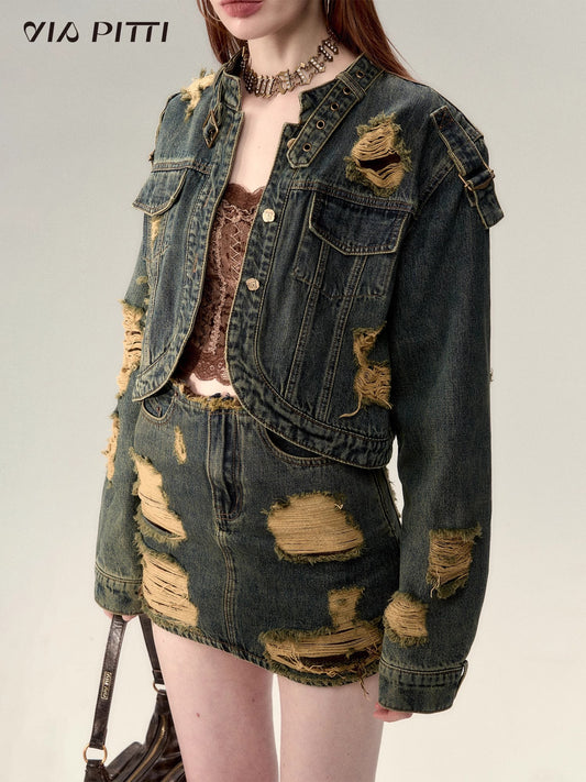Washed Damaged Denim Jacket & Damaged Denim Skirt Setup NA4668