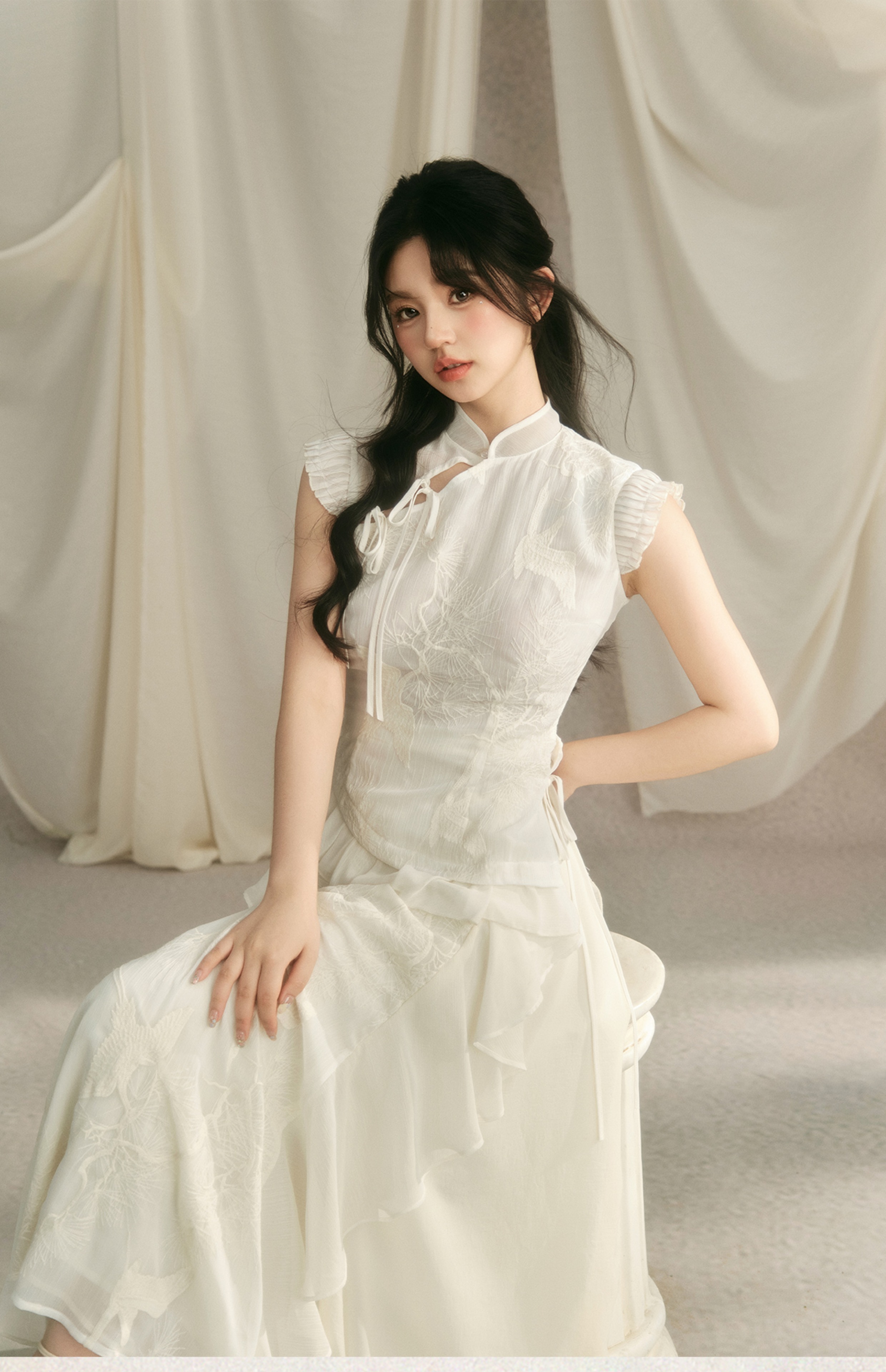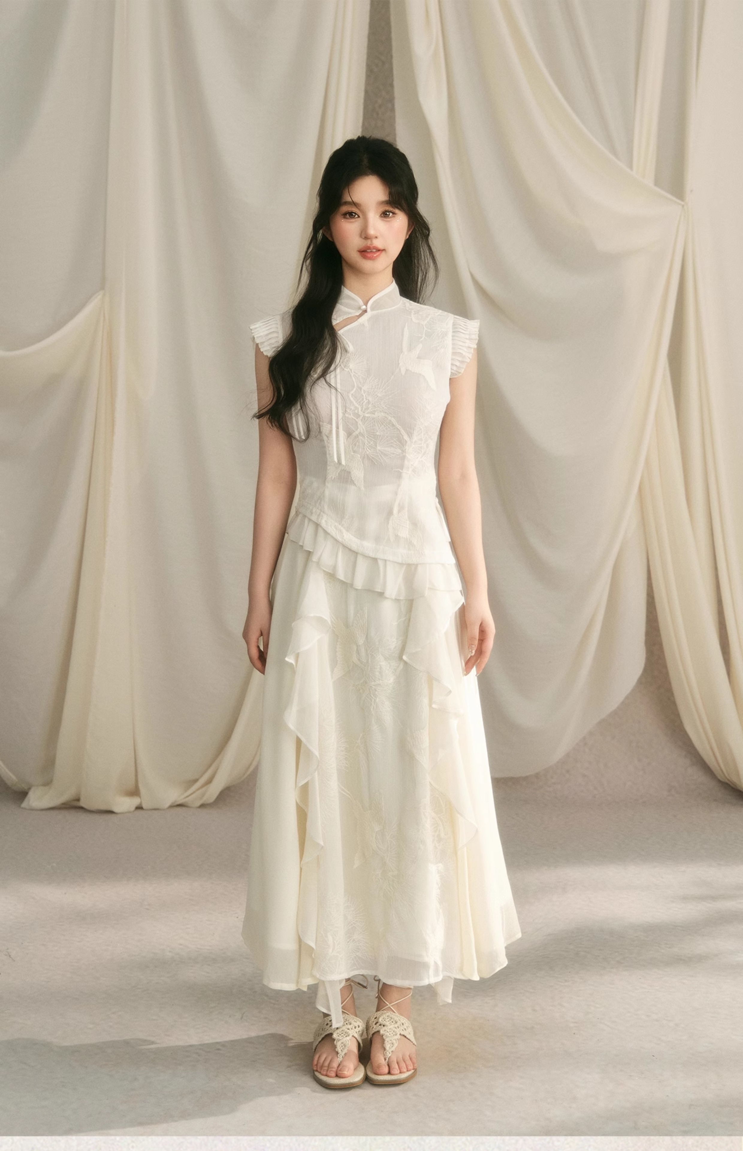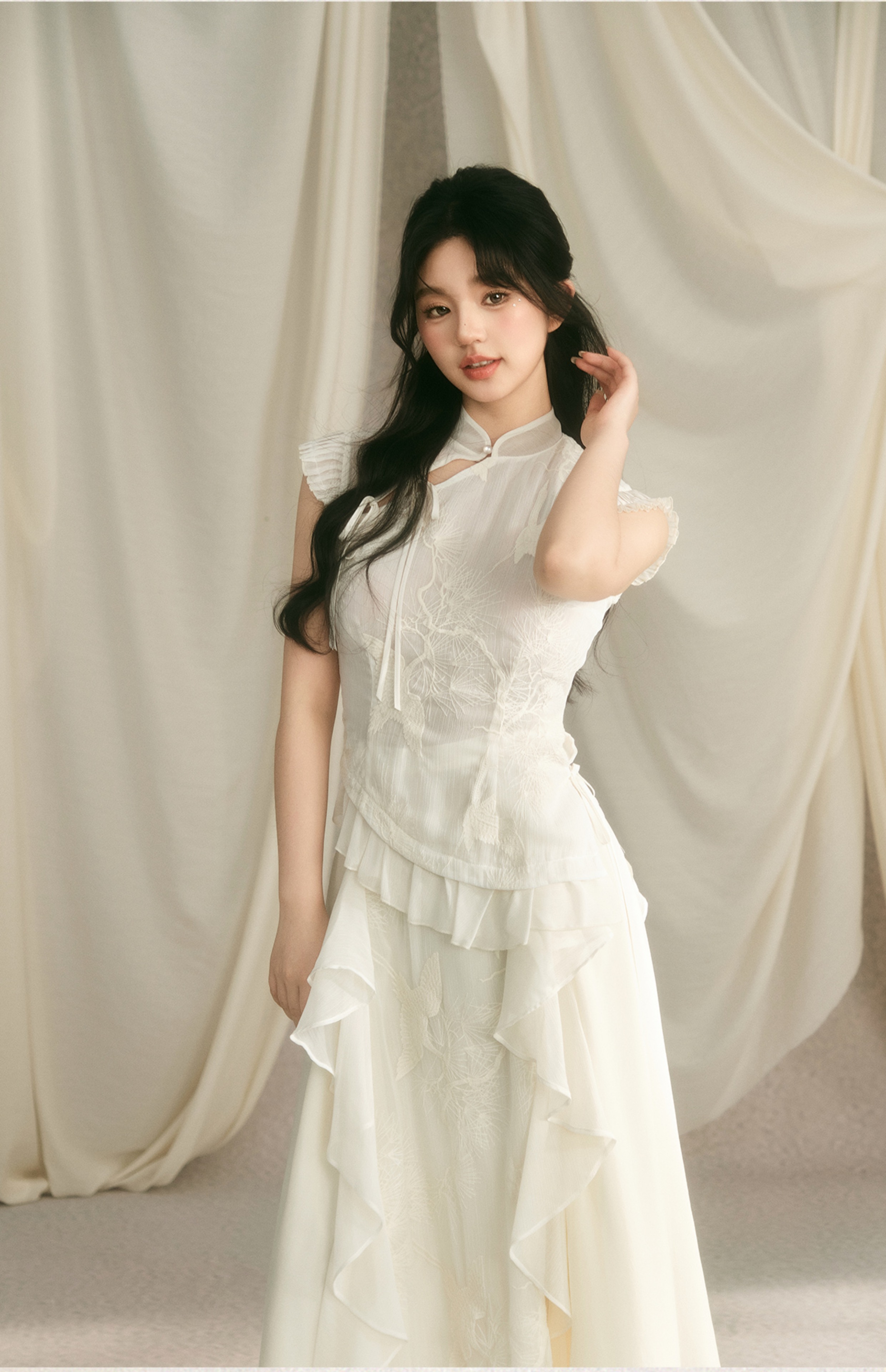 Embroidery Ruffle Qipao Top & Ruffle Hem Skirt Setup NA7443