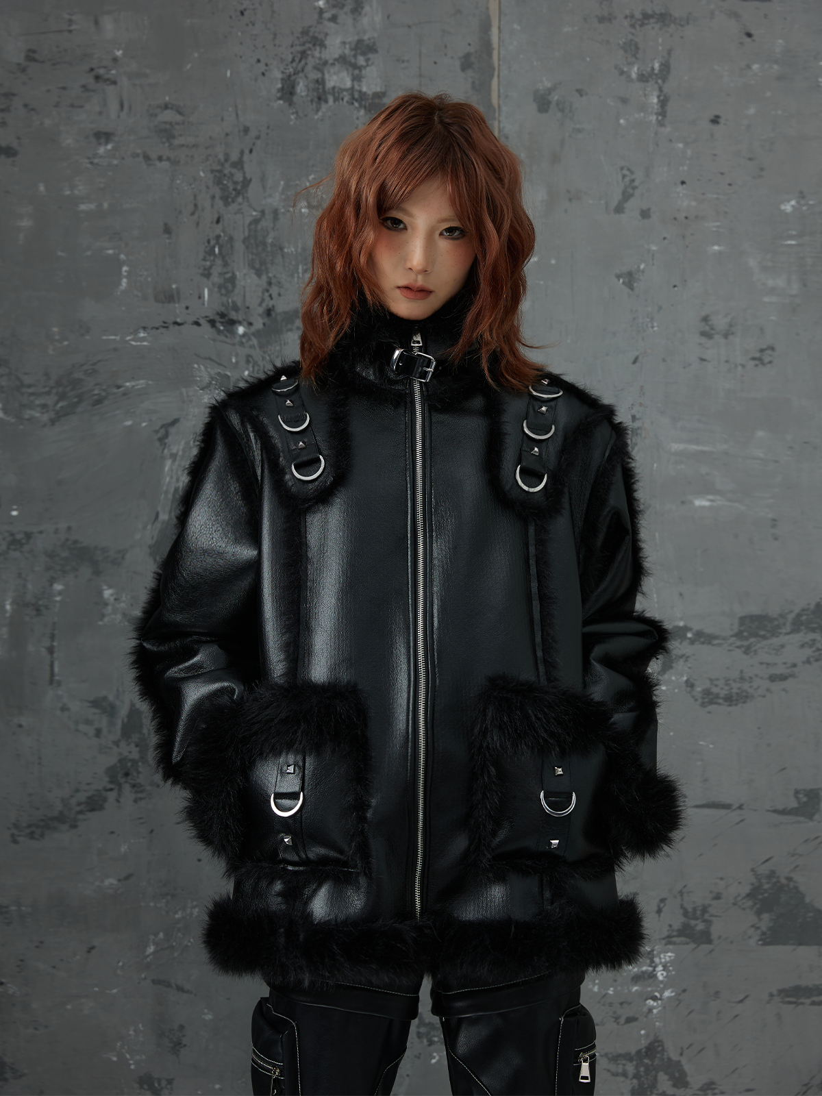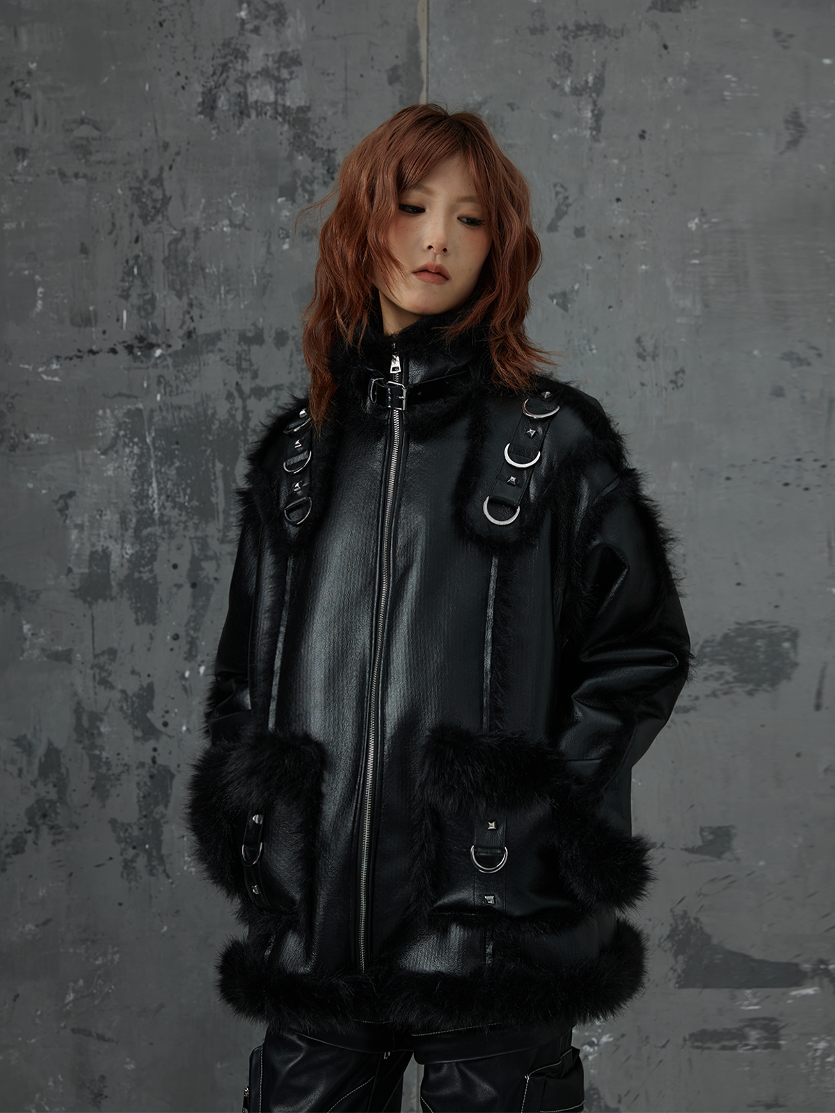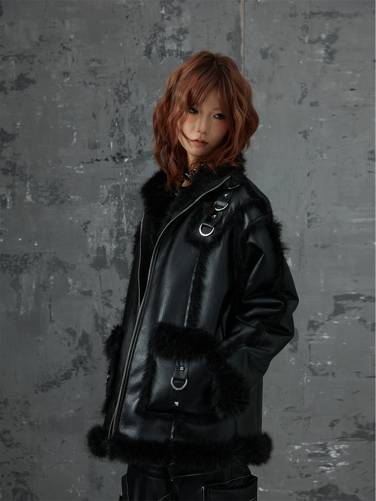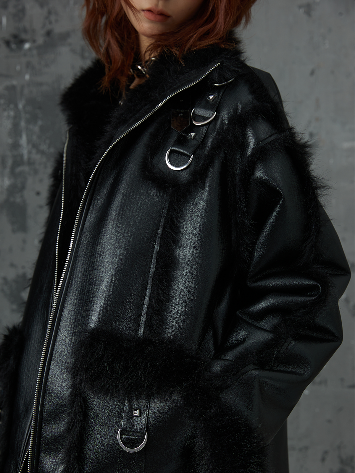 Punk Oversize Metal-Accent Shearling Jacket NA8147