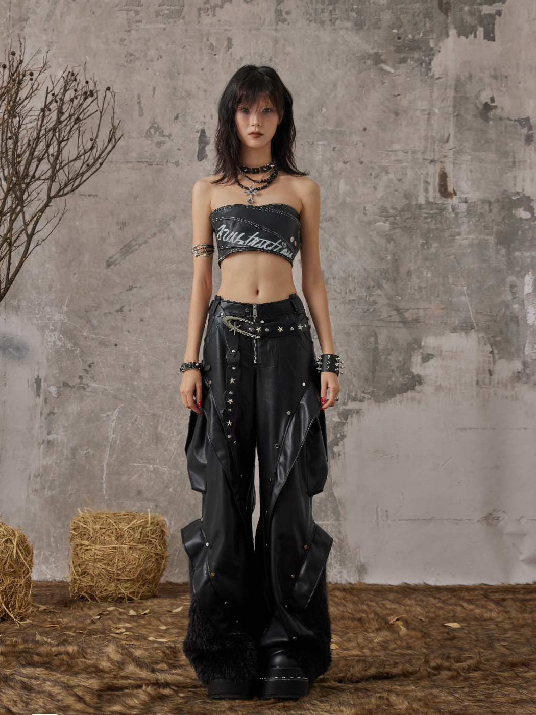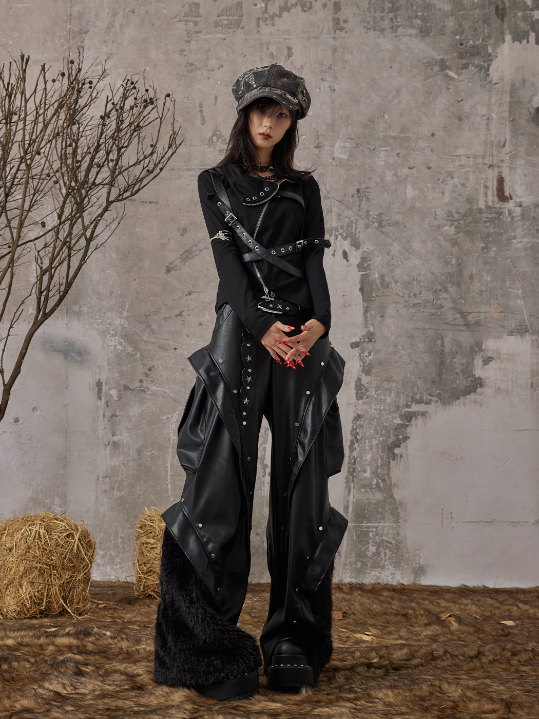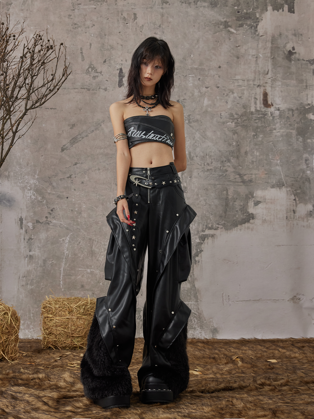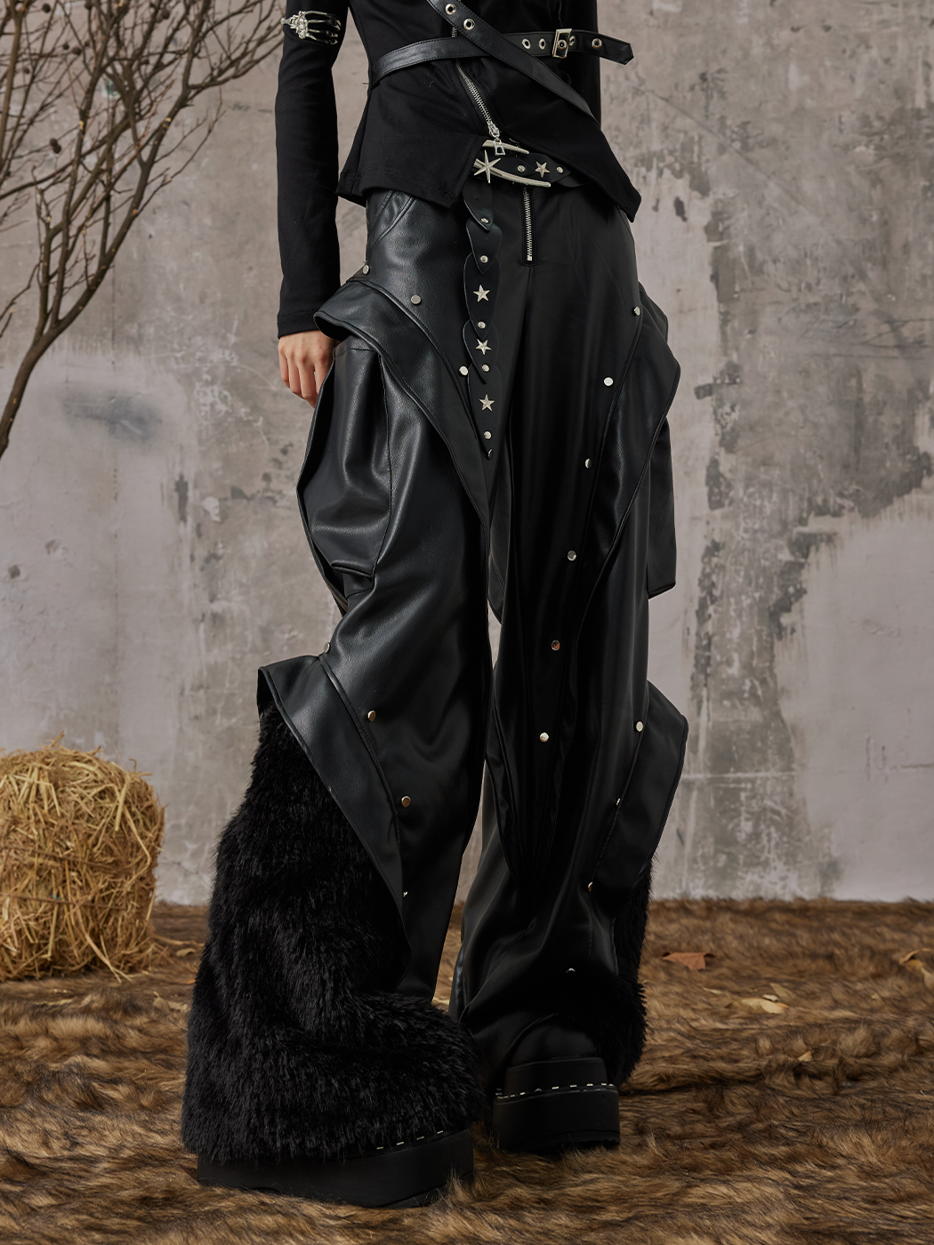 Studded Multi-Pocket Patchwork Fuzzy Wide-Leg PU Leather Pants NA8164
