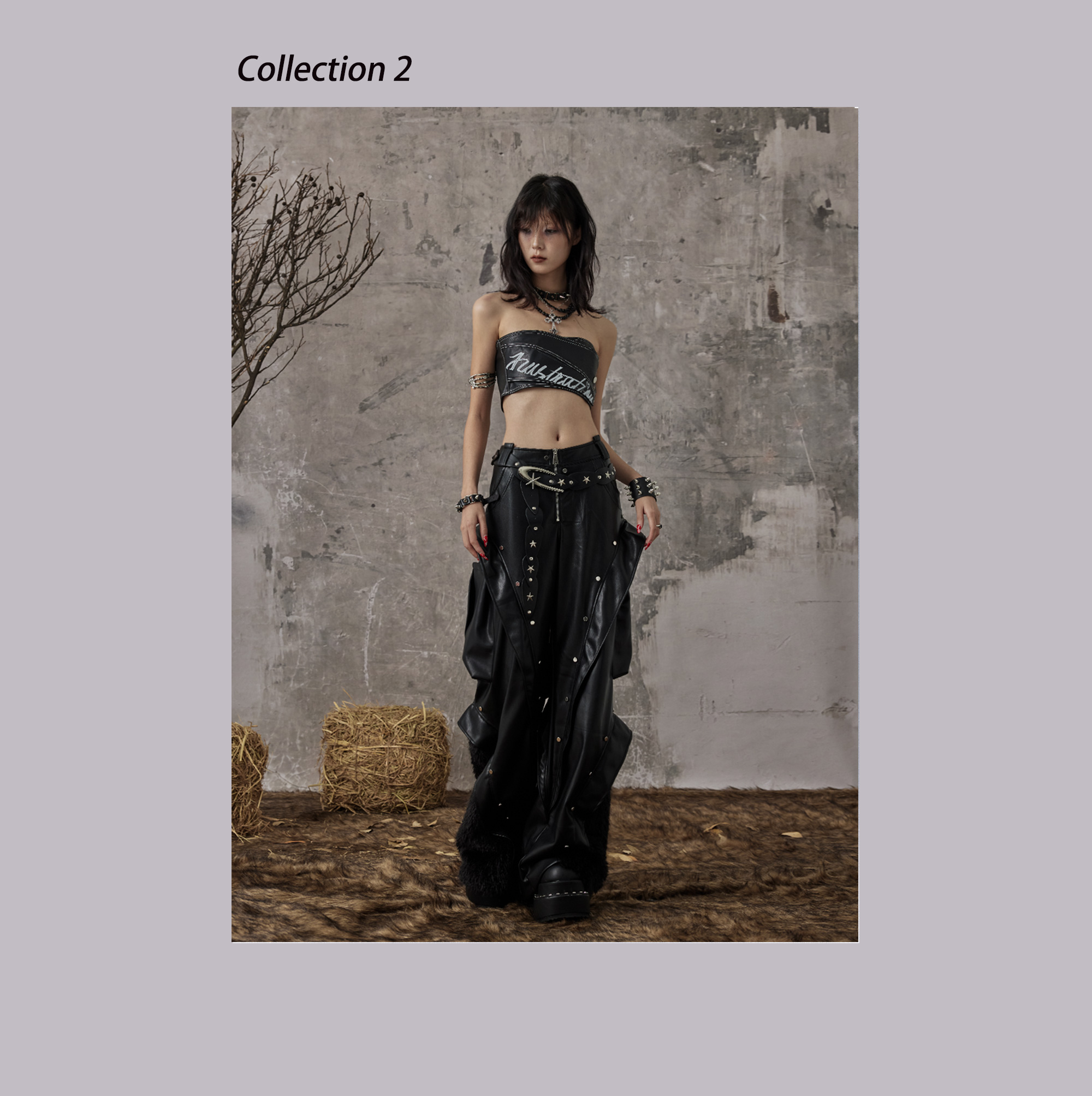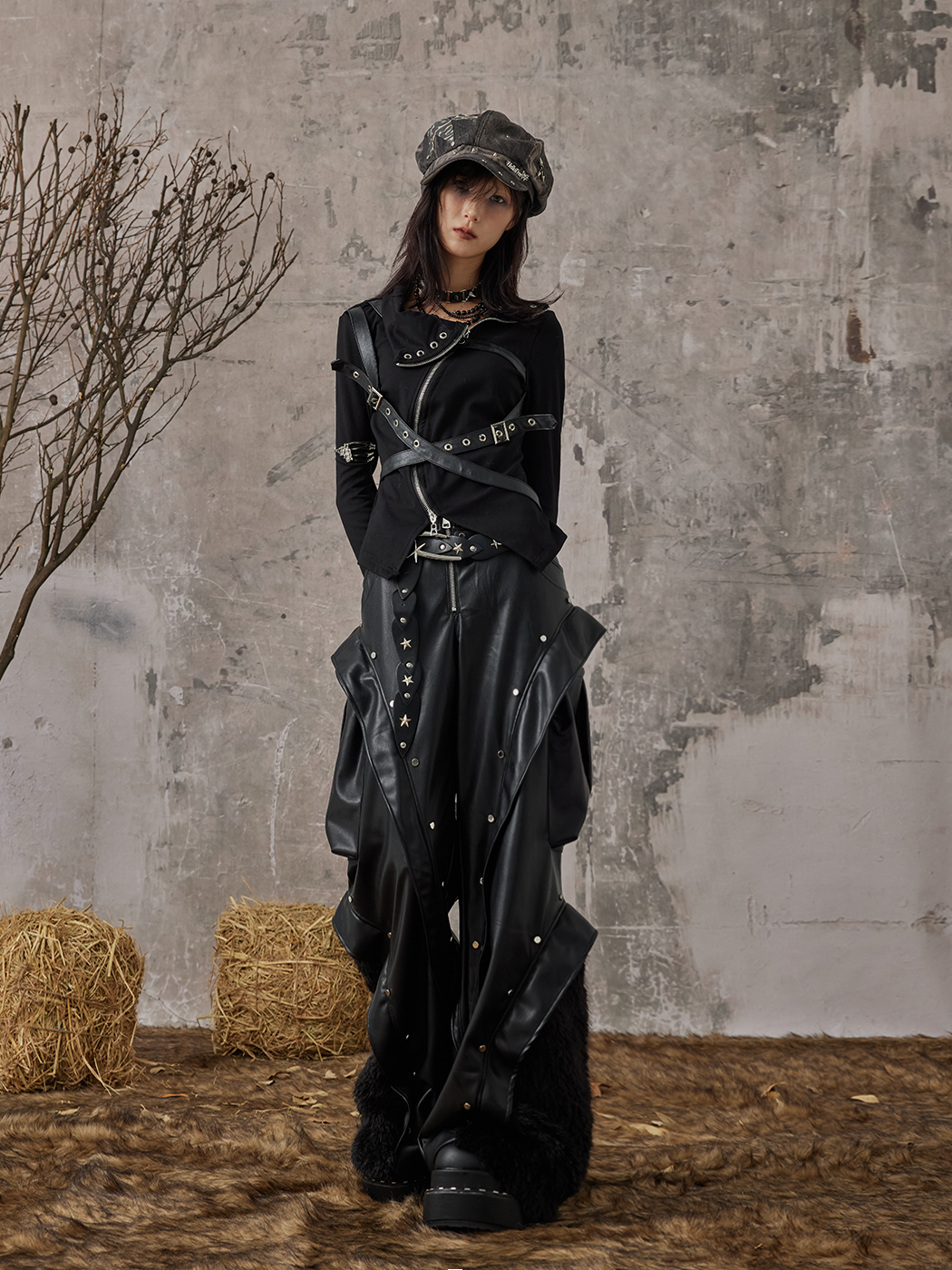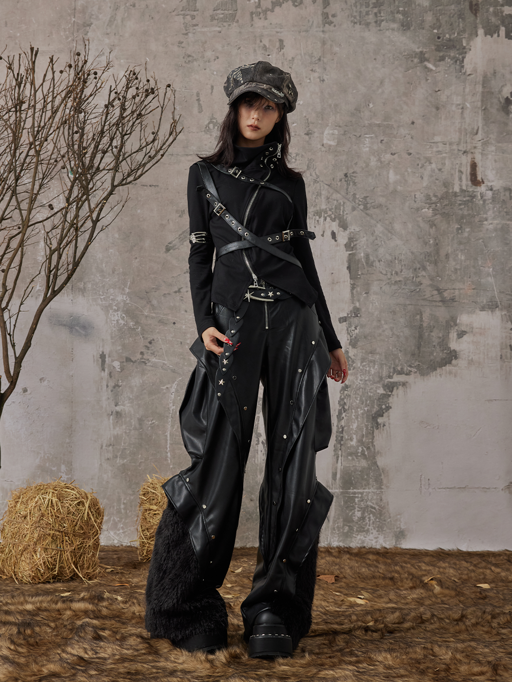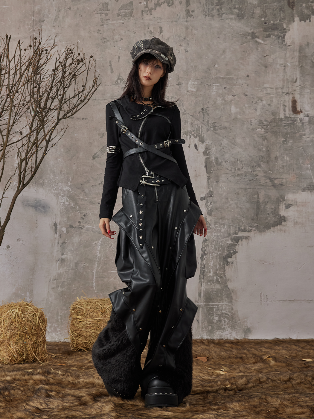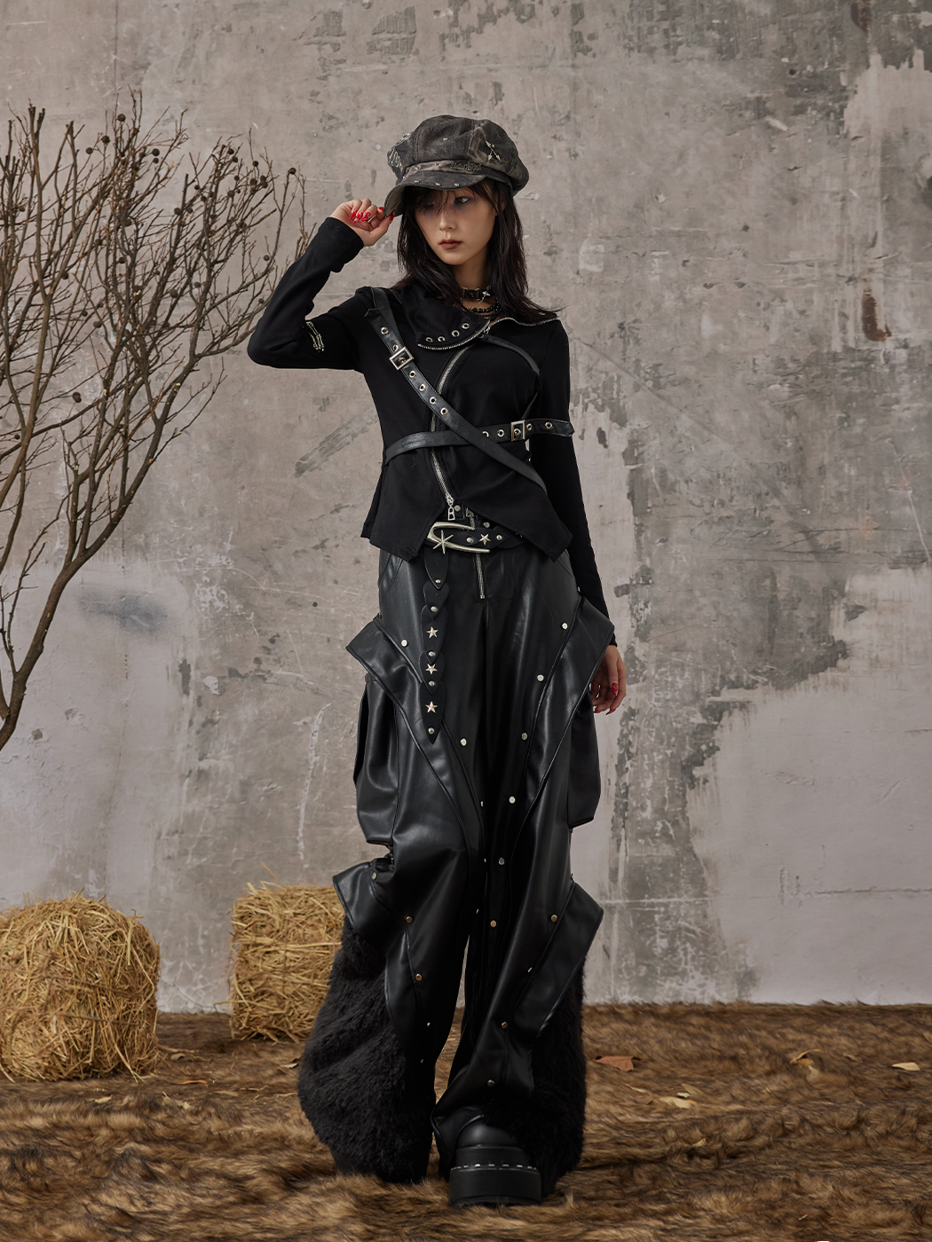 Studded Multi-Pocket Patchwork Fuzzy Wide-Leg PU Leather Pants NA8164