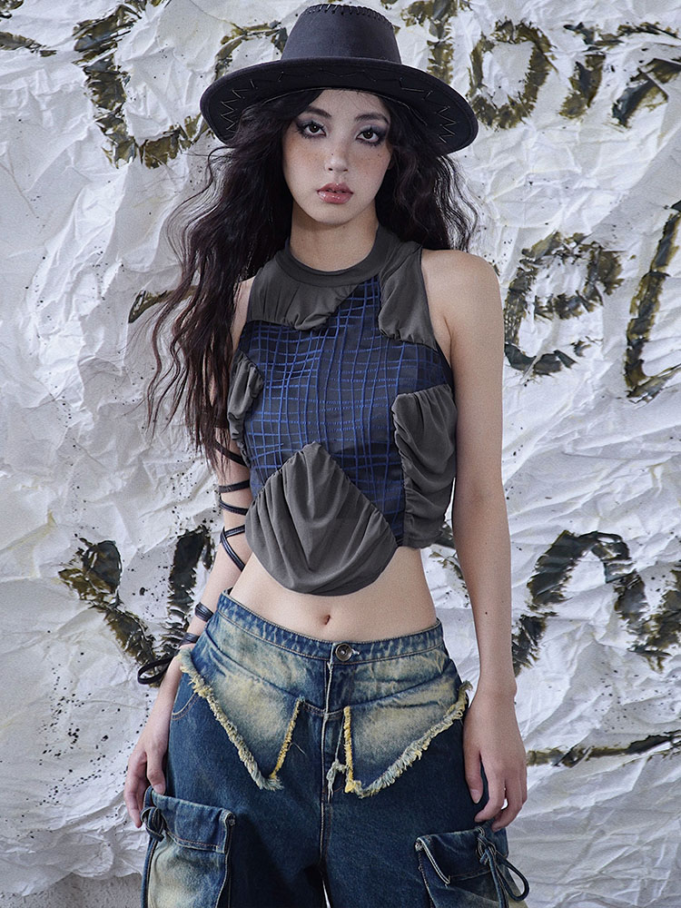 Mesh Pleats Patchwork Cropped Tank Top NA7733