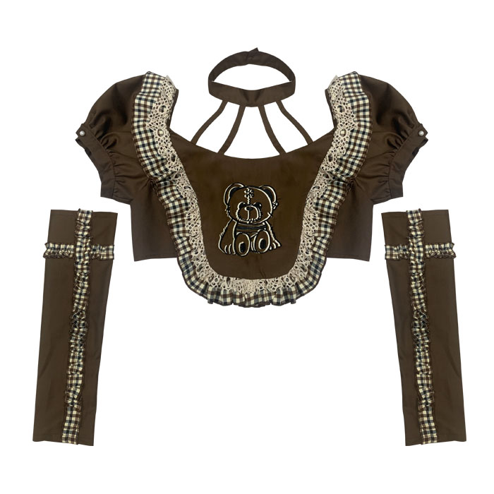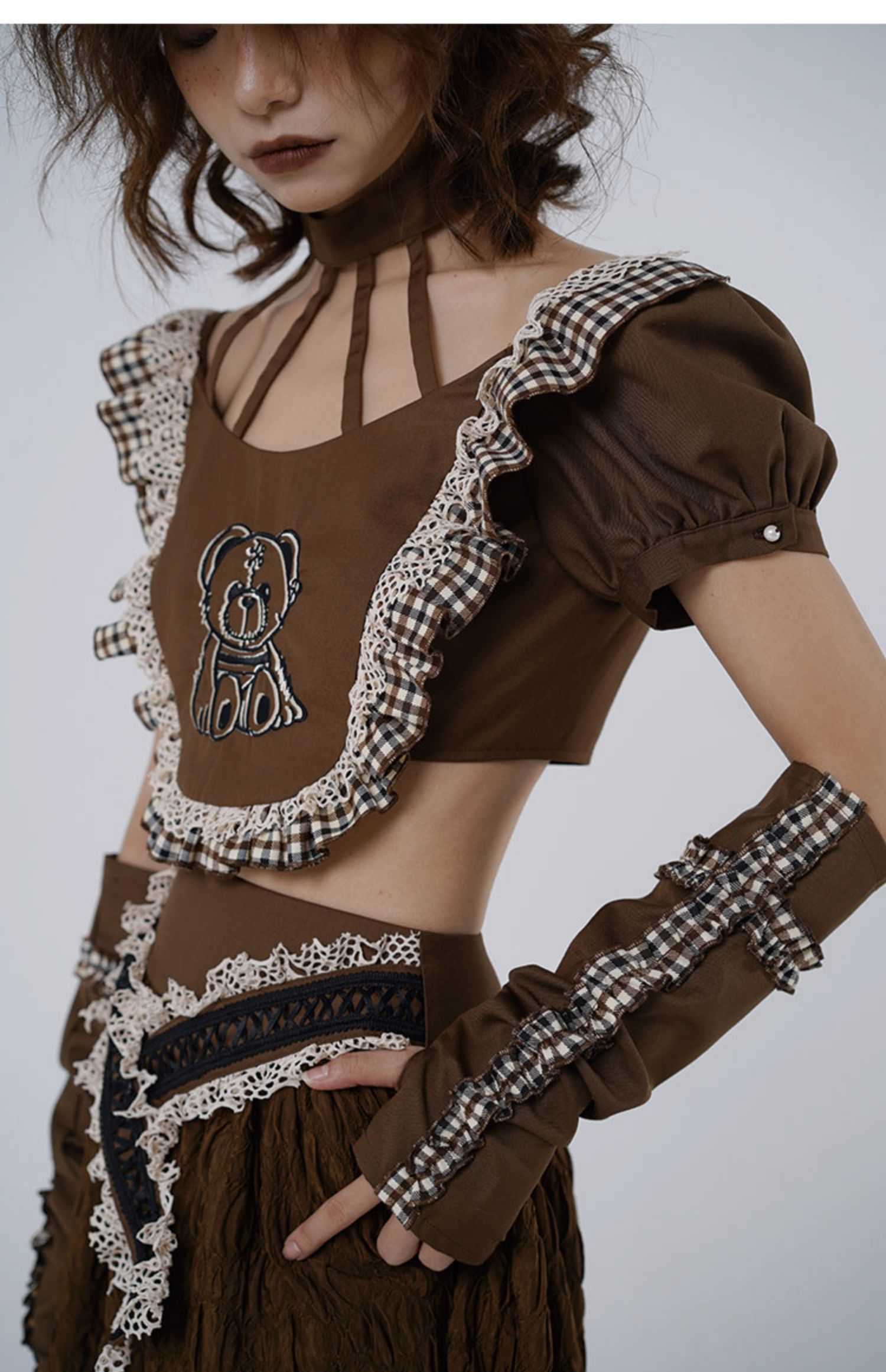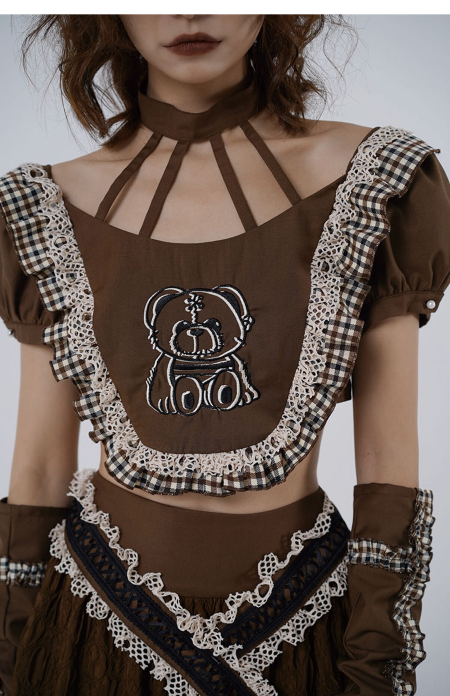 Bear Embroidery Ruffle Lace Short Sleeve Blouse NA7740