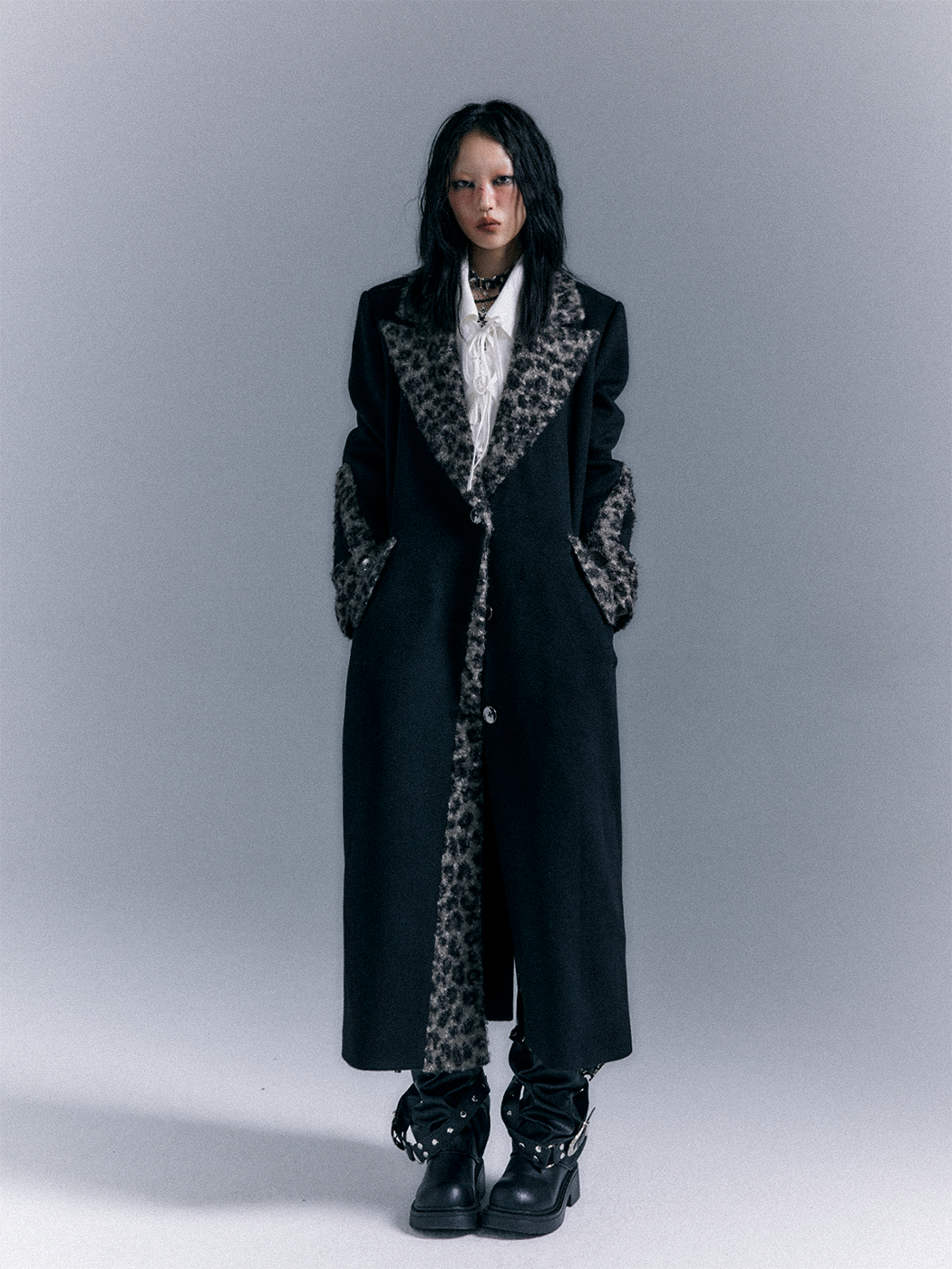 Shoulder Pad Leopard Print Patchwork Wool Coat NA8125