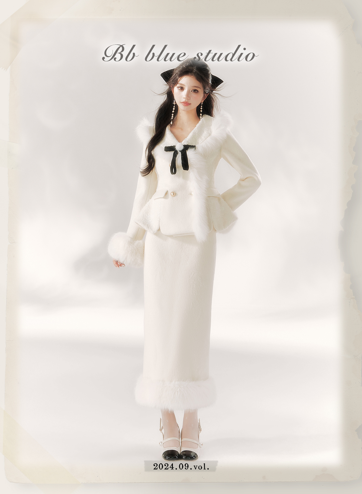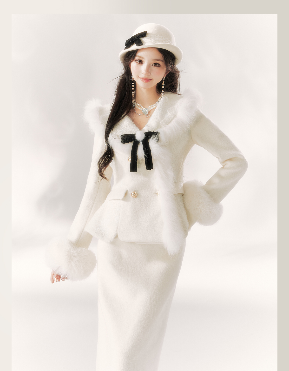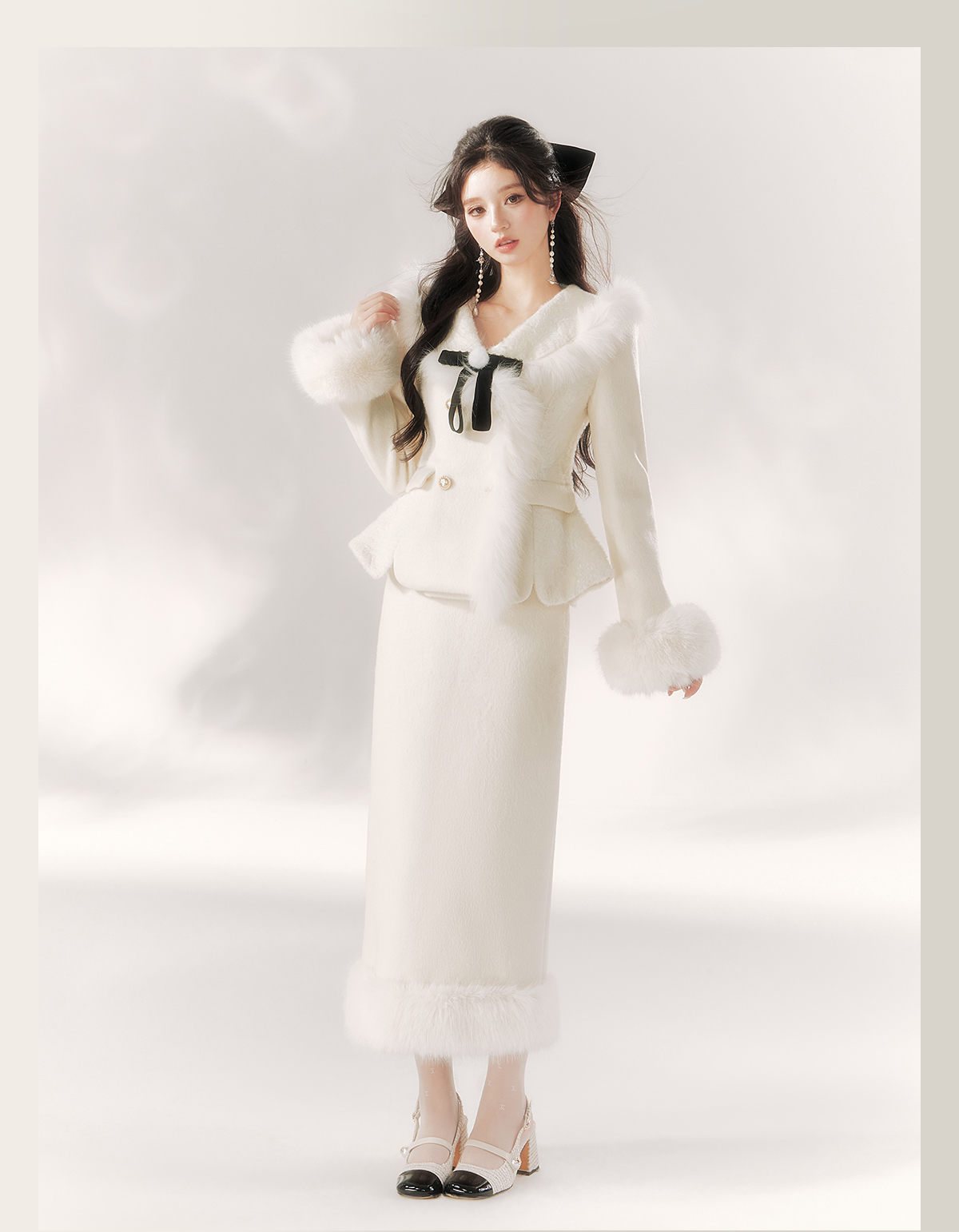 Fox Fur Trim Waist-Defining Jacket & Long Skirt Setup NA7435