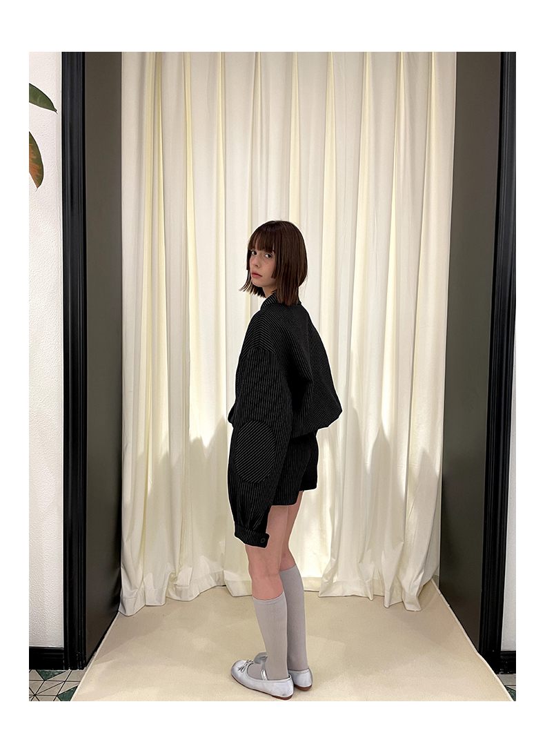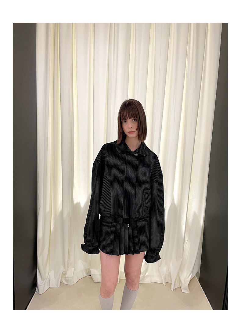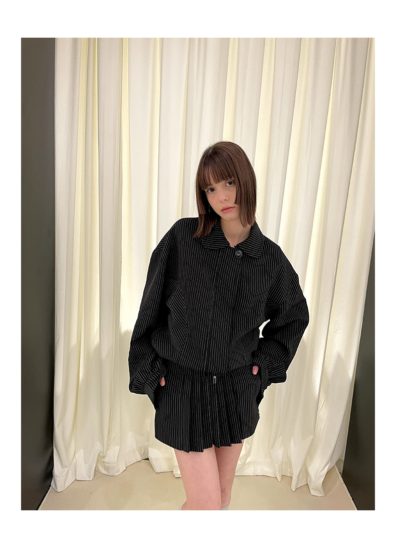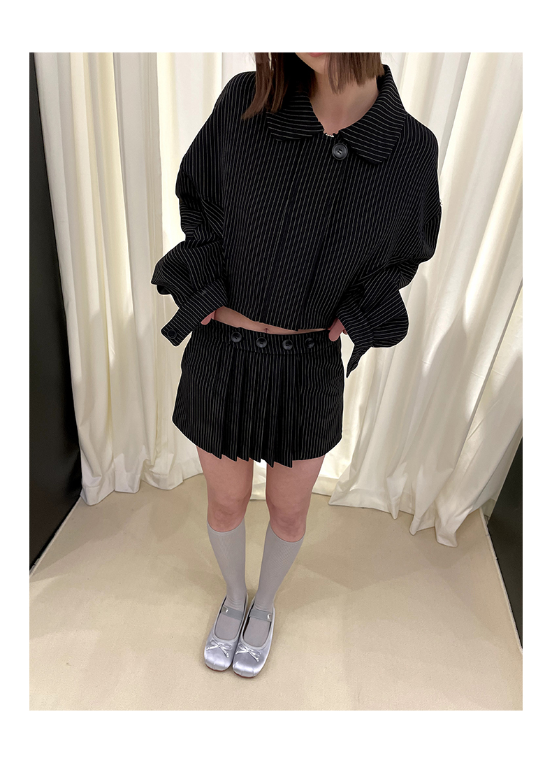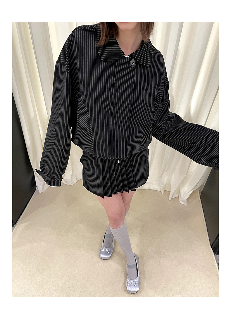 Stripe Polo Collar Jacket & Pleated Short Skirt Setup NA5986