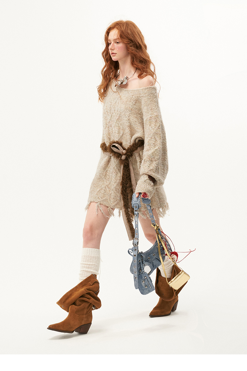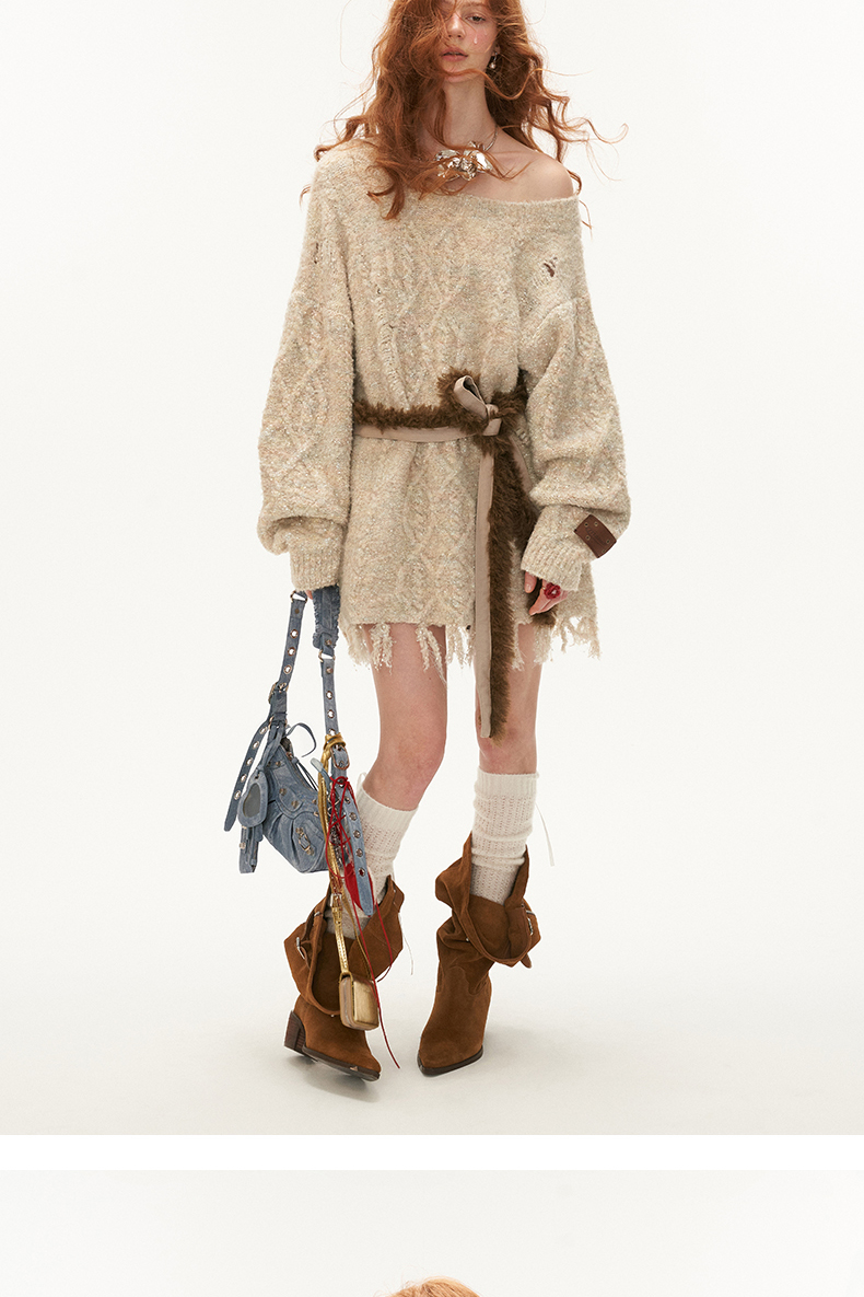 Wool Blend Tassel Knit Sweater & Waist Belt NA5713