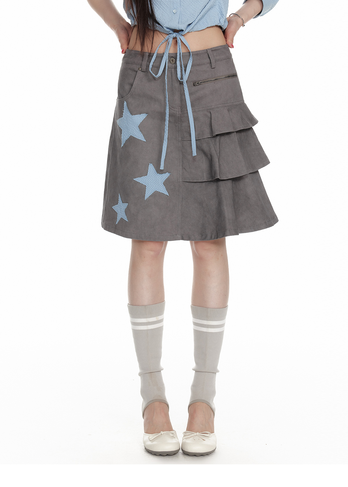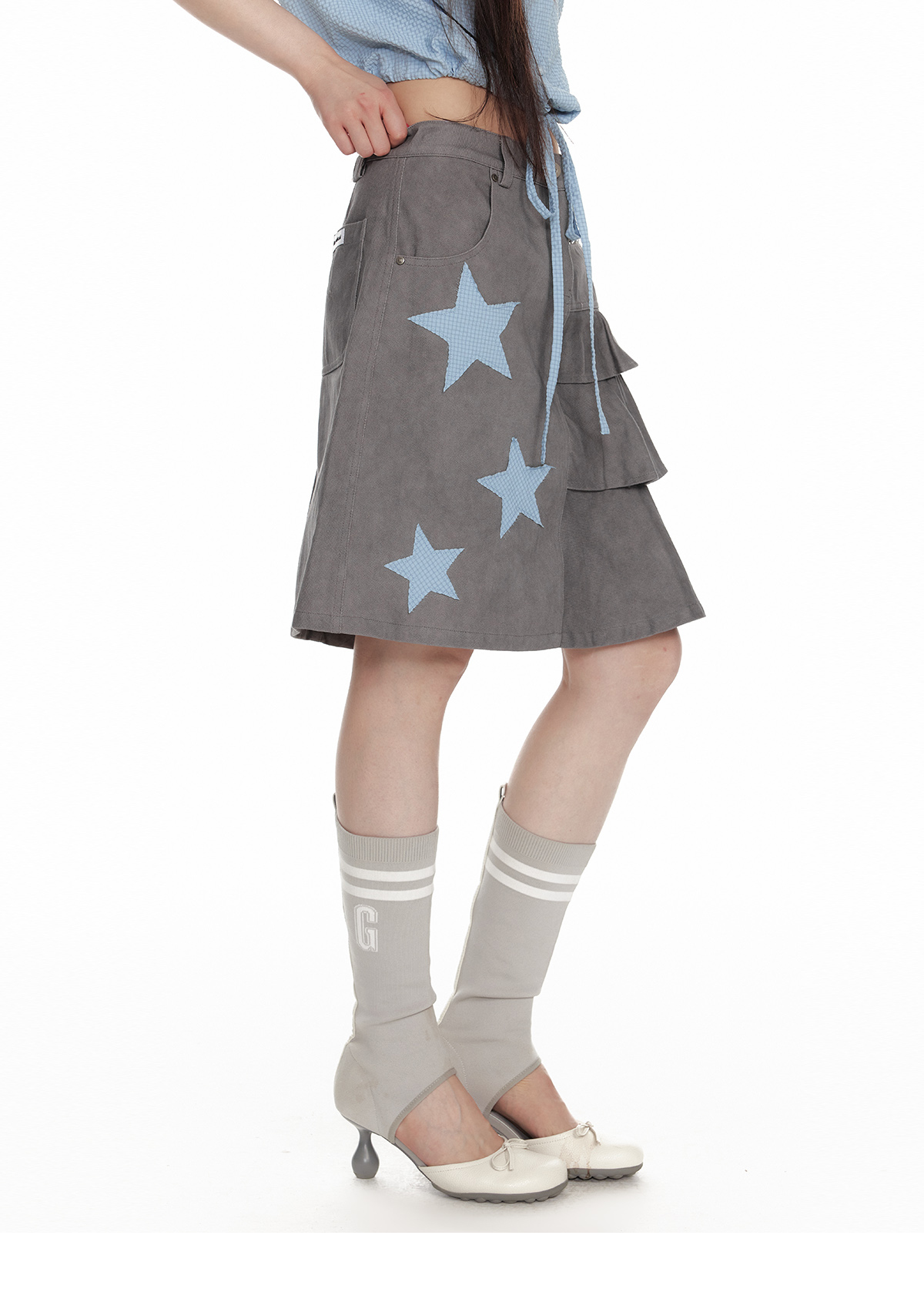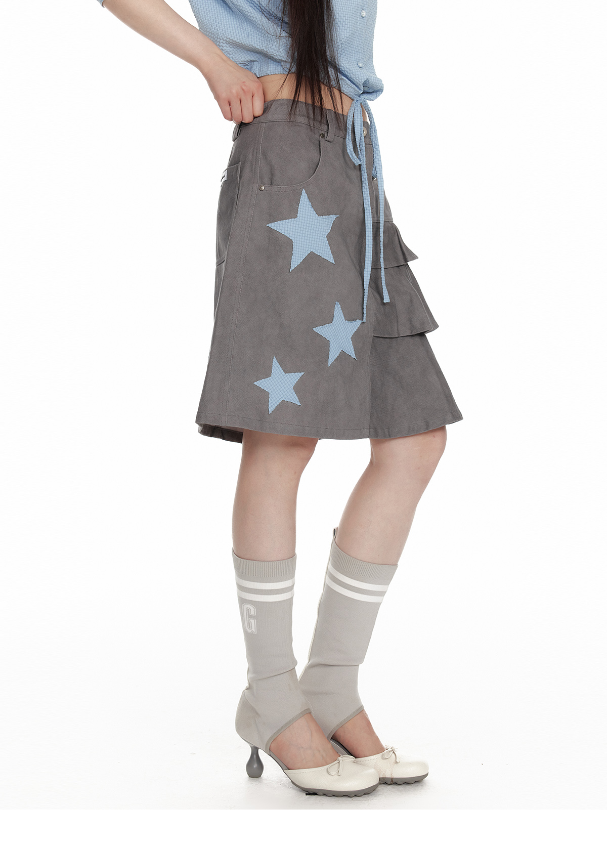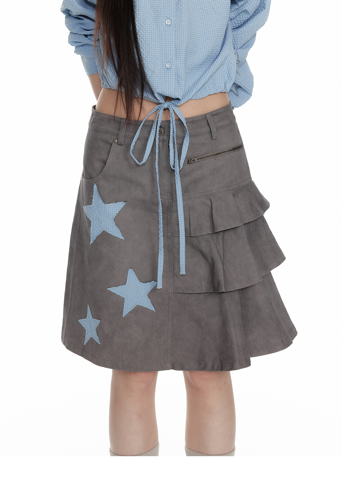 Ruffled Plaid Star Pleated Midi Skirt NA7117