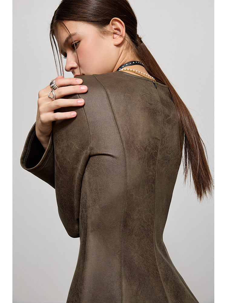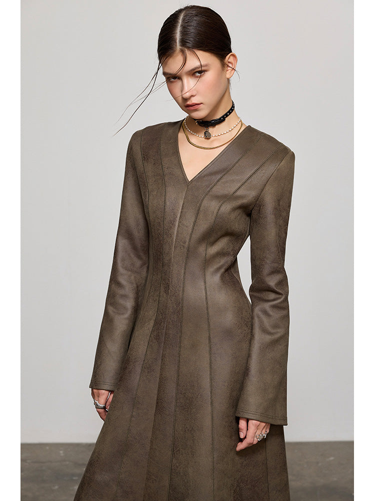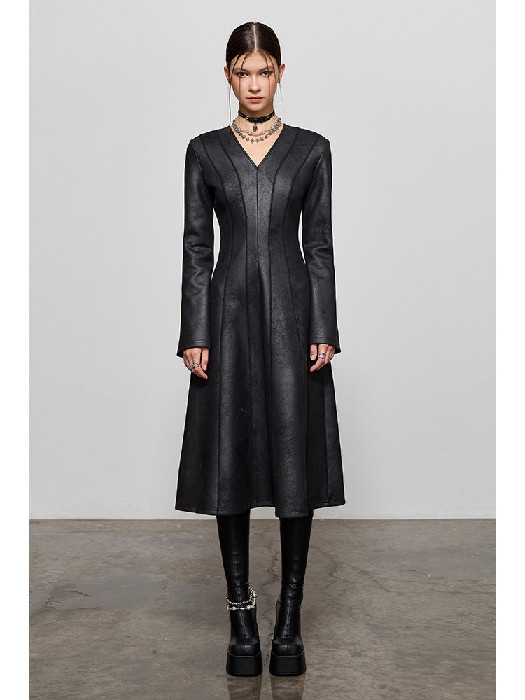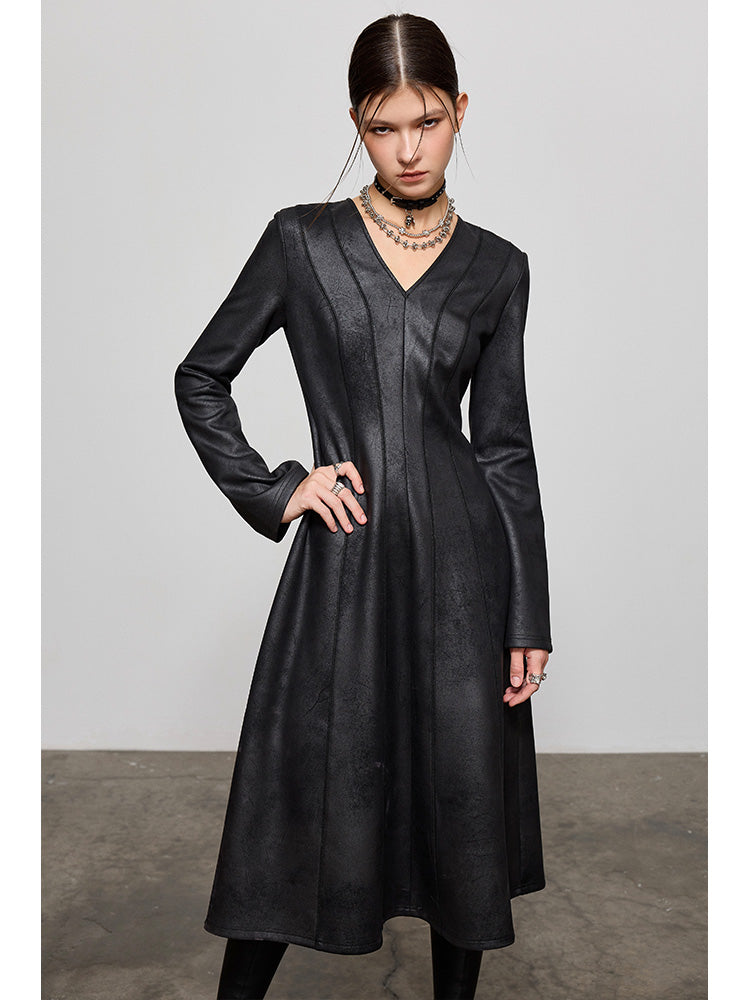 PU Leather Waist-cinching Midi Dress NA4241