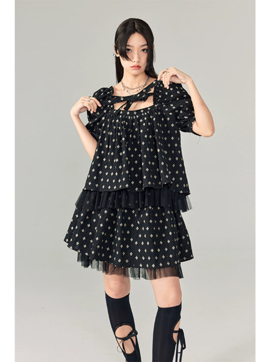 Polka Dot Pattern Lace Splicing Short Sleeve Shirt & Short Skirt Setup NA5409