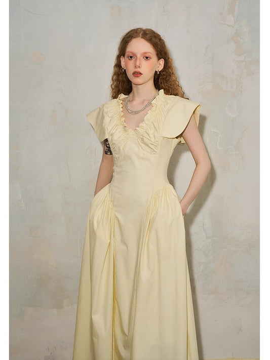 Wrinkled V-neck French Flying Sleeve Cinched Waist Dress NA5368