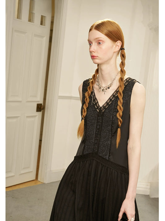 V-neck Lace Stripe Splicing Sleeveless Long Dress NA5384