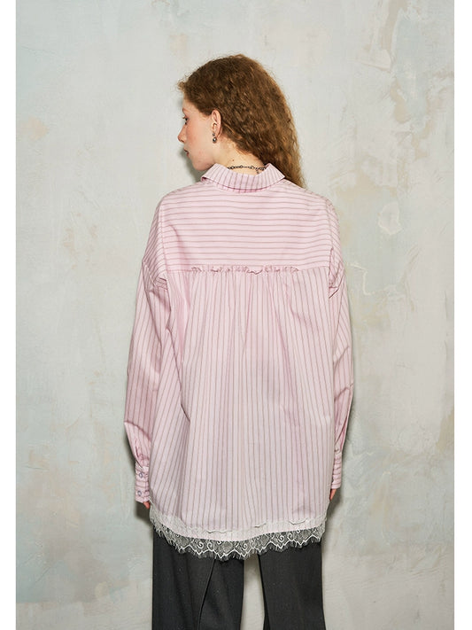 Stripe Lace Hollow Bow Long Sleeve Shirt NA5370