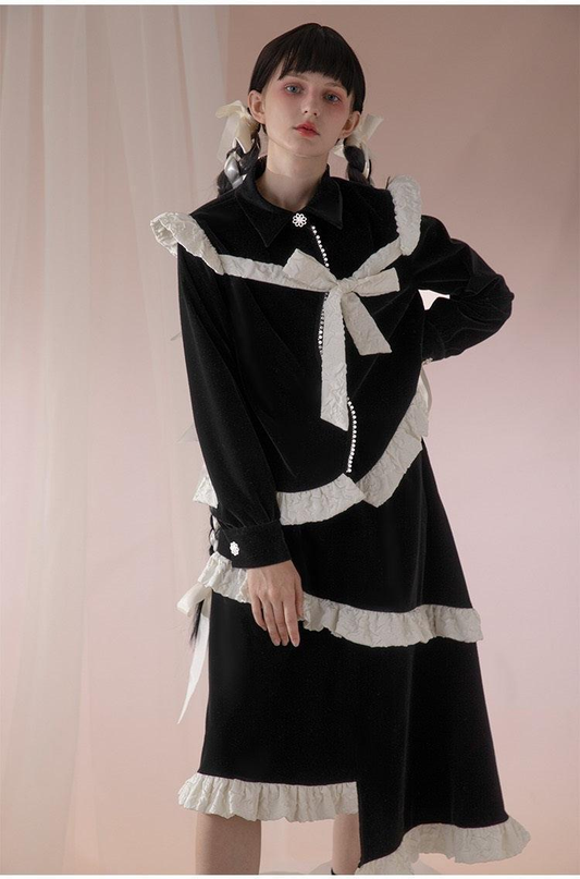 Asymmetrical Frill Tie Velvet Shirt & Asymmetrical Frill Velvet Skirt Setup WNW1237