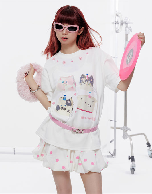 Cat Graphic Button Detail Oversize Short Sleeve T-Shirt & Belt NA8203