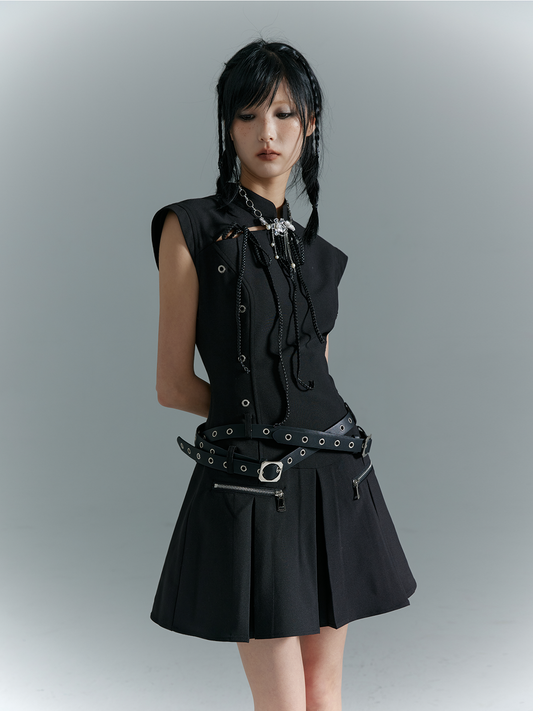 Cutout Pleats Qipao Sleeveless Dress with Belt NA8177
