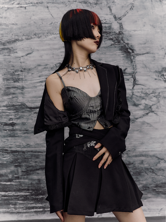 Floral Camisole Bustier & Flare Leg Warmers & Pleats Skirt & Cropped Jacket Setup NA8112