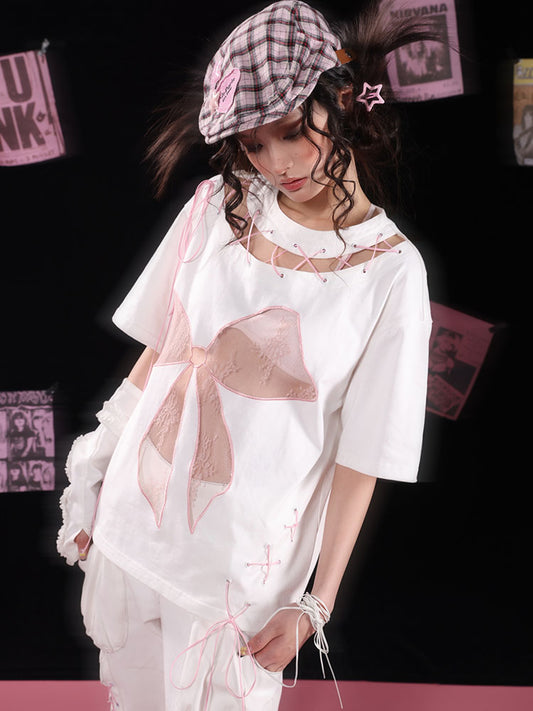 Lace Bow Hollow-Out Tie-Strap Short Sleeve T-Shirt NA7764