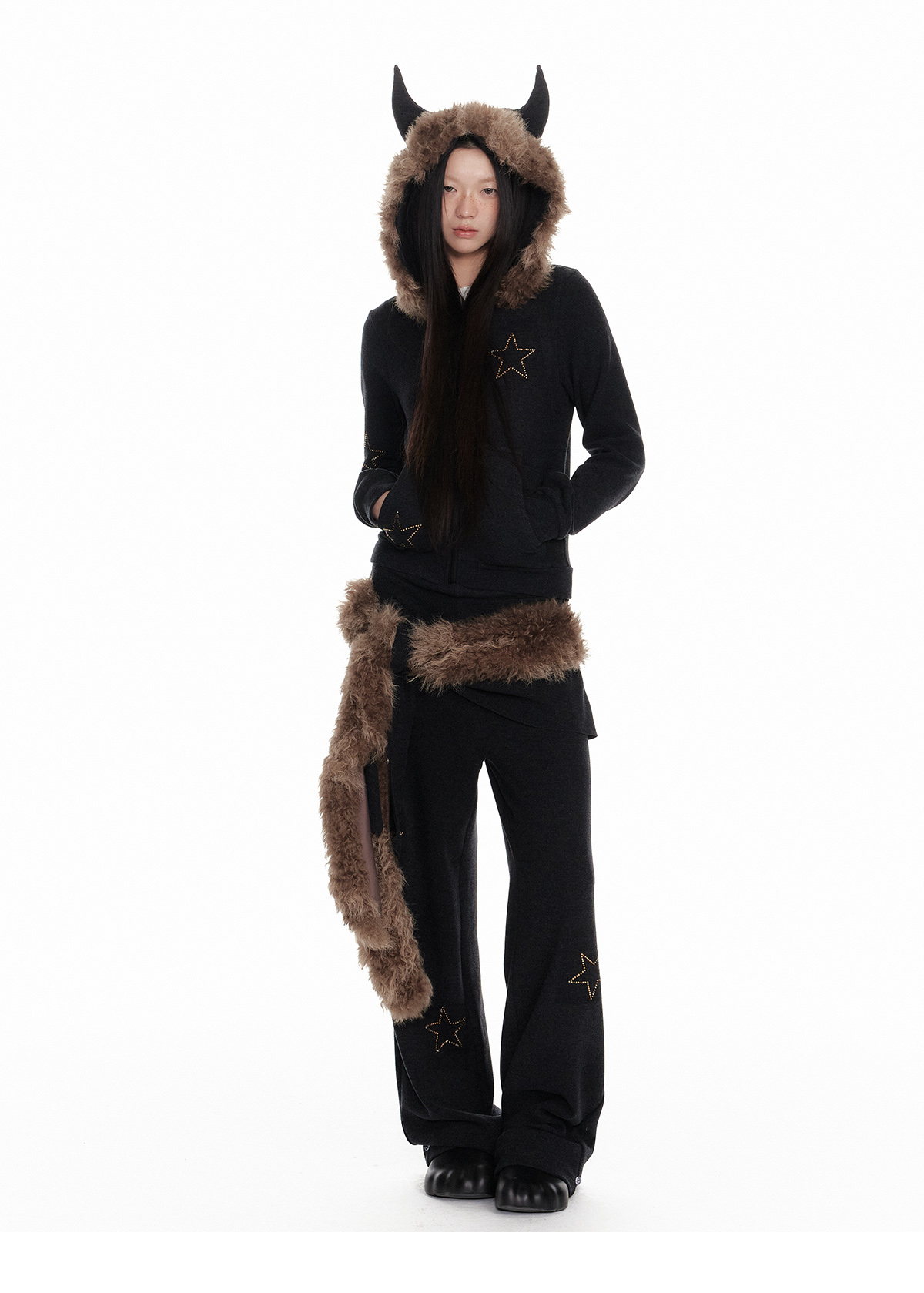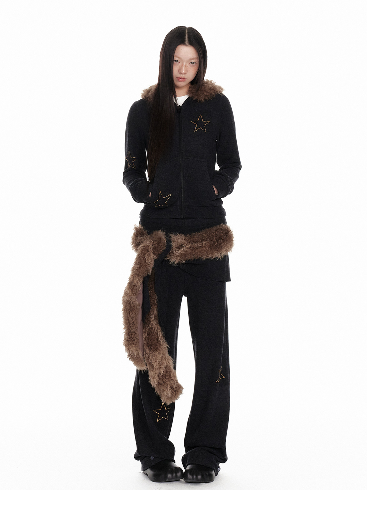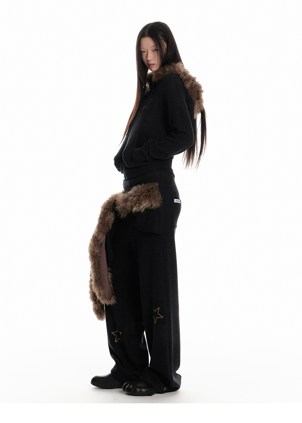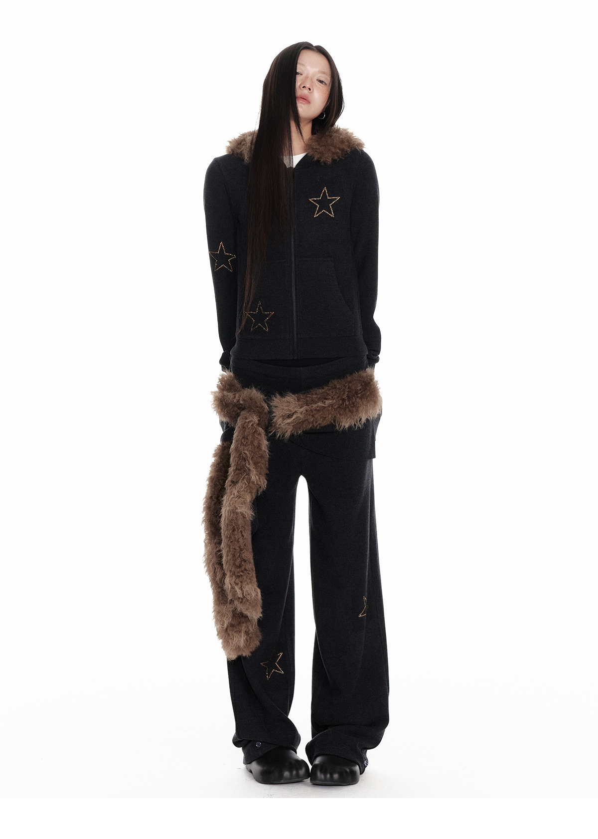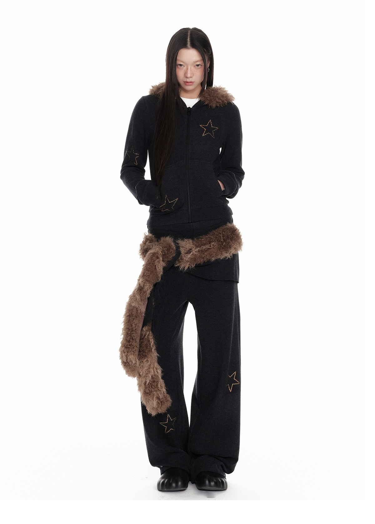 Horn Fur Collar Fuzzy Zipper Hoodie & Wide-Leg Pants Setup NA7102