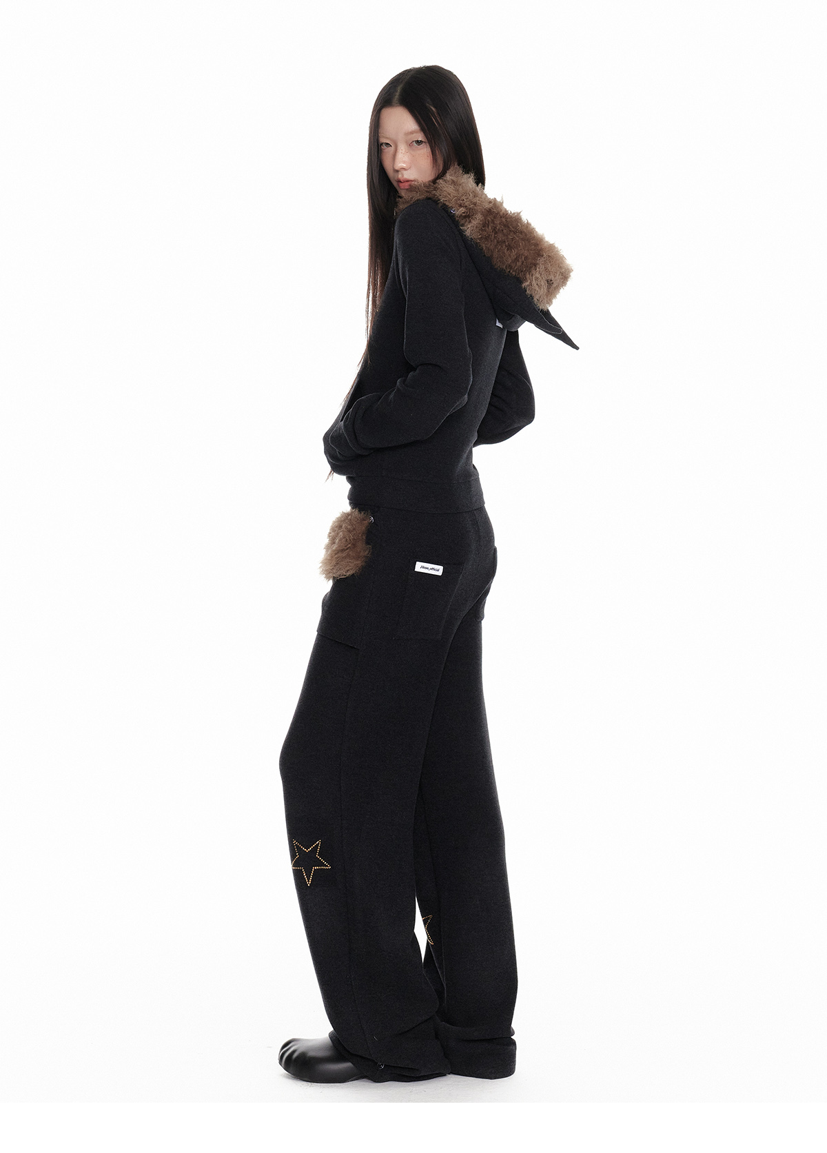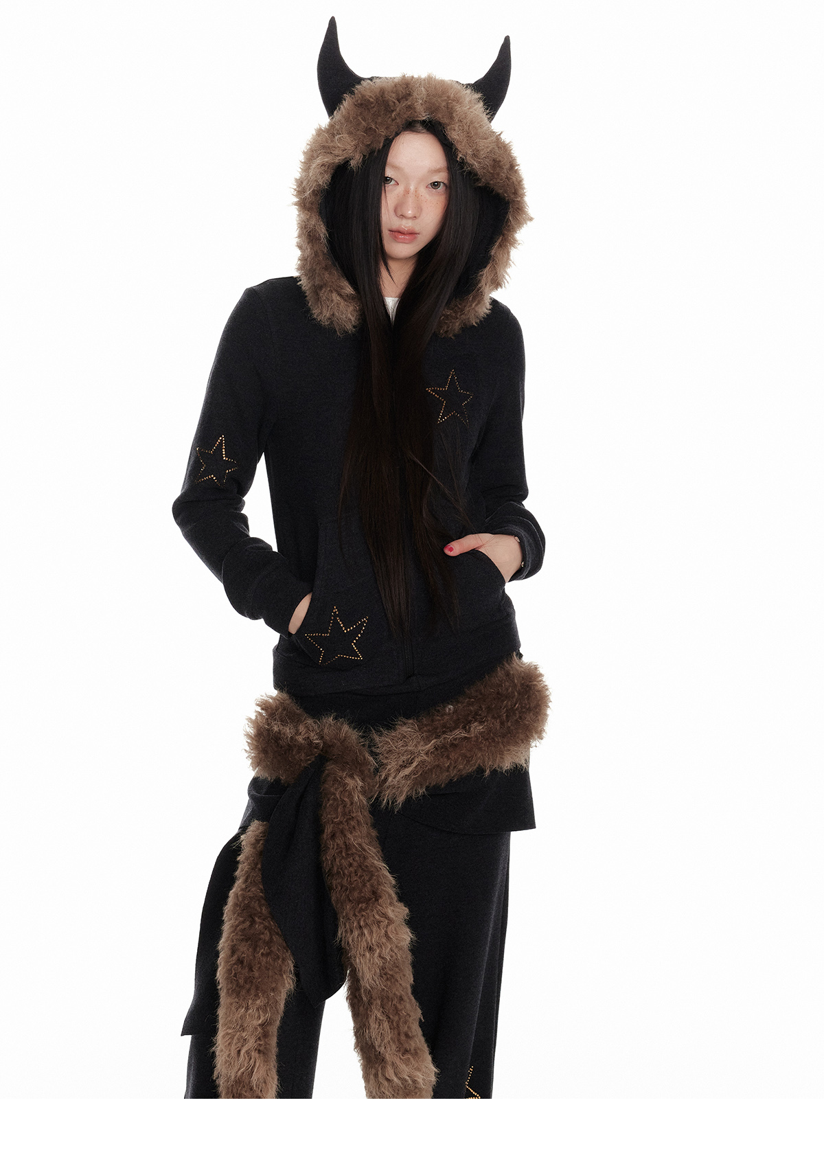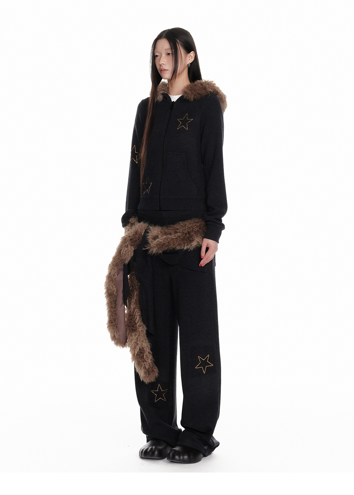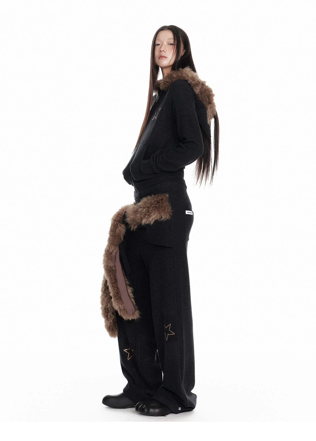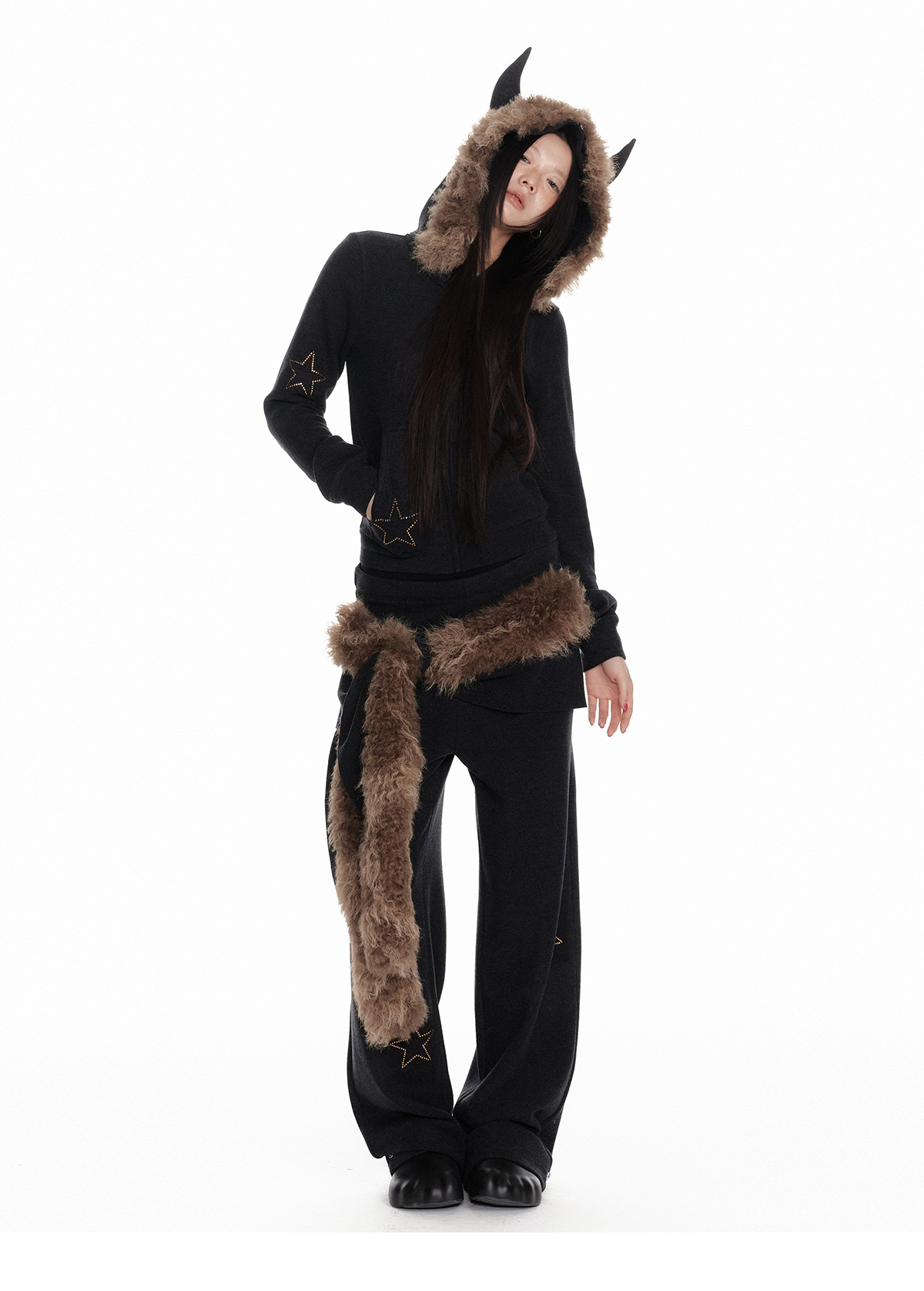 Horn Fur Collar Fuzzy Zipper Hoodie & Wide-Leg Pants Setup NA7102
