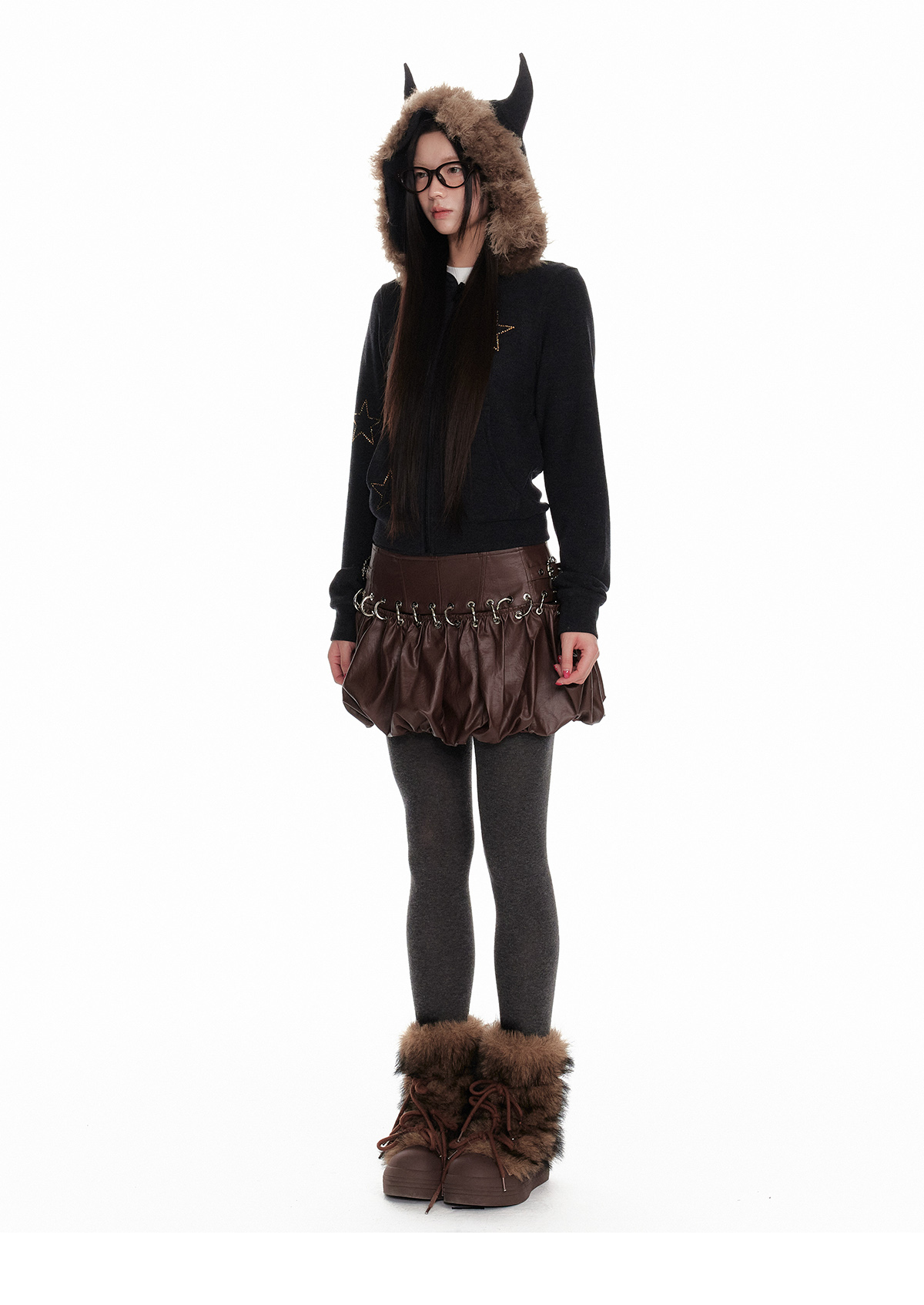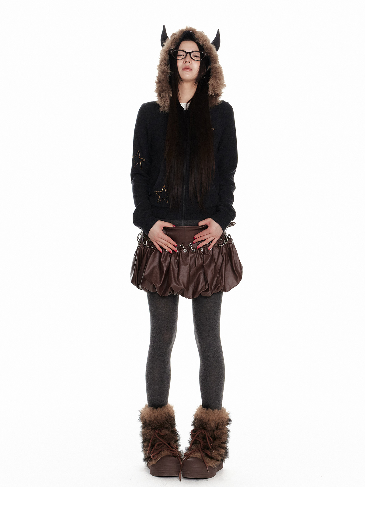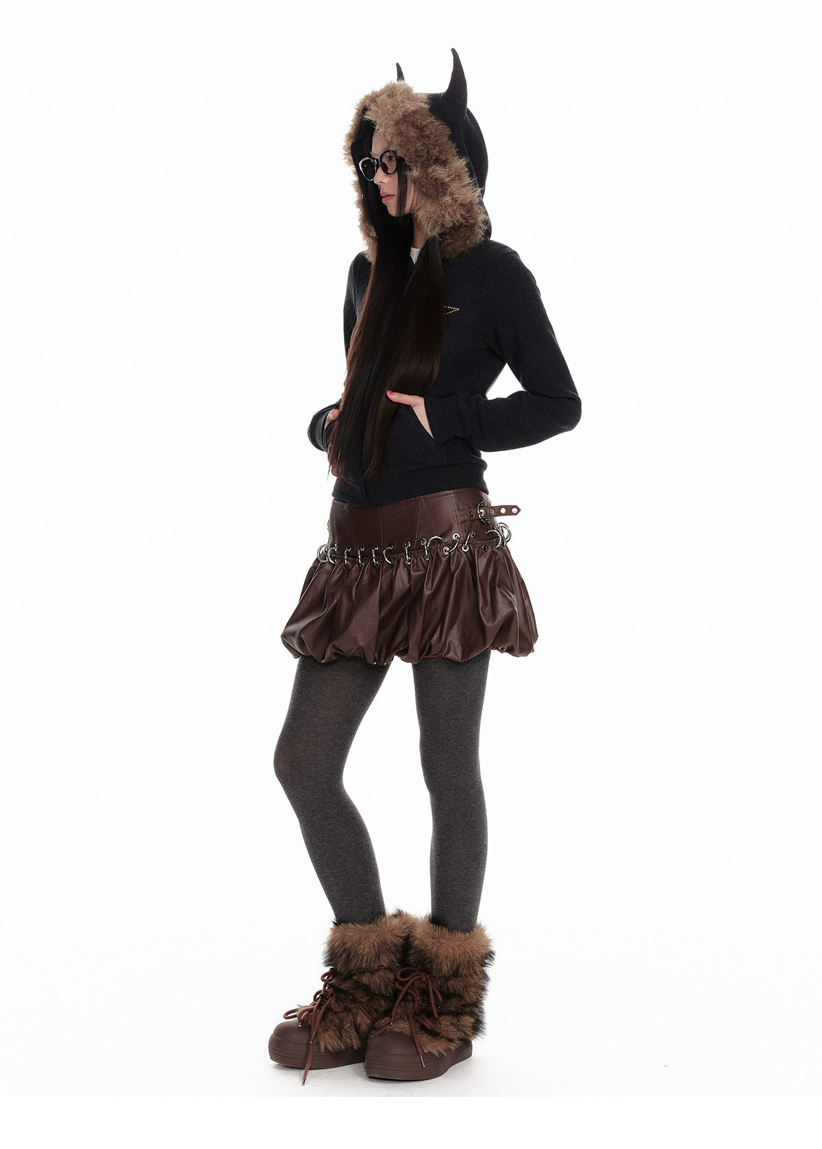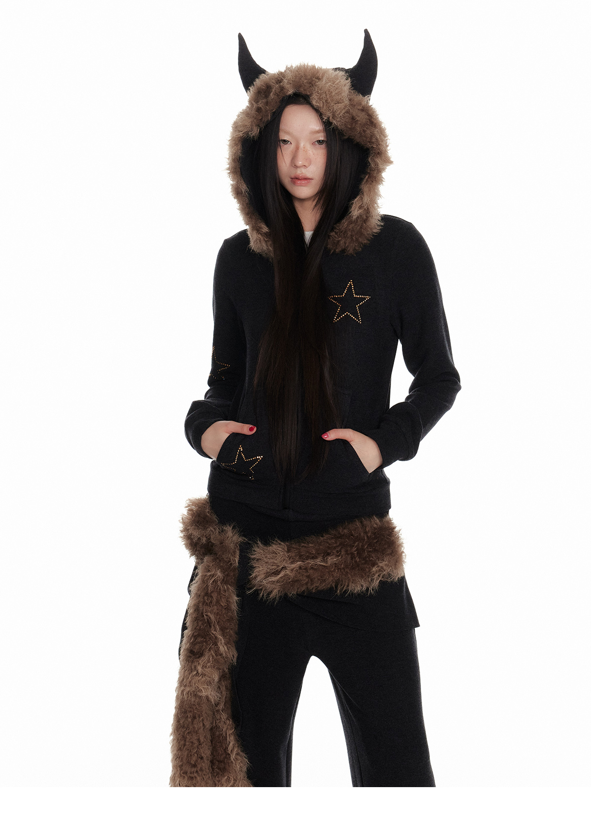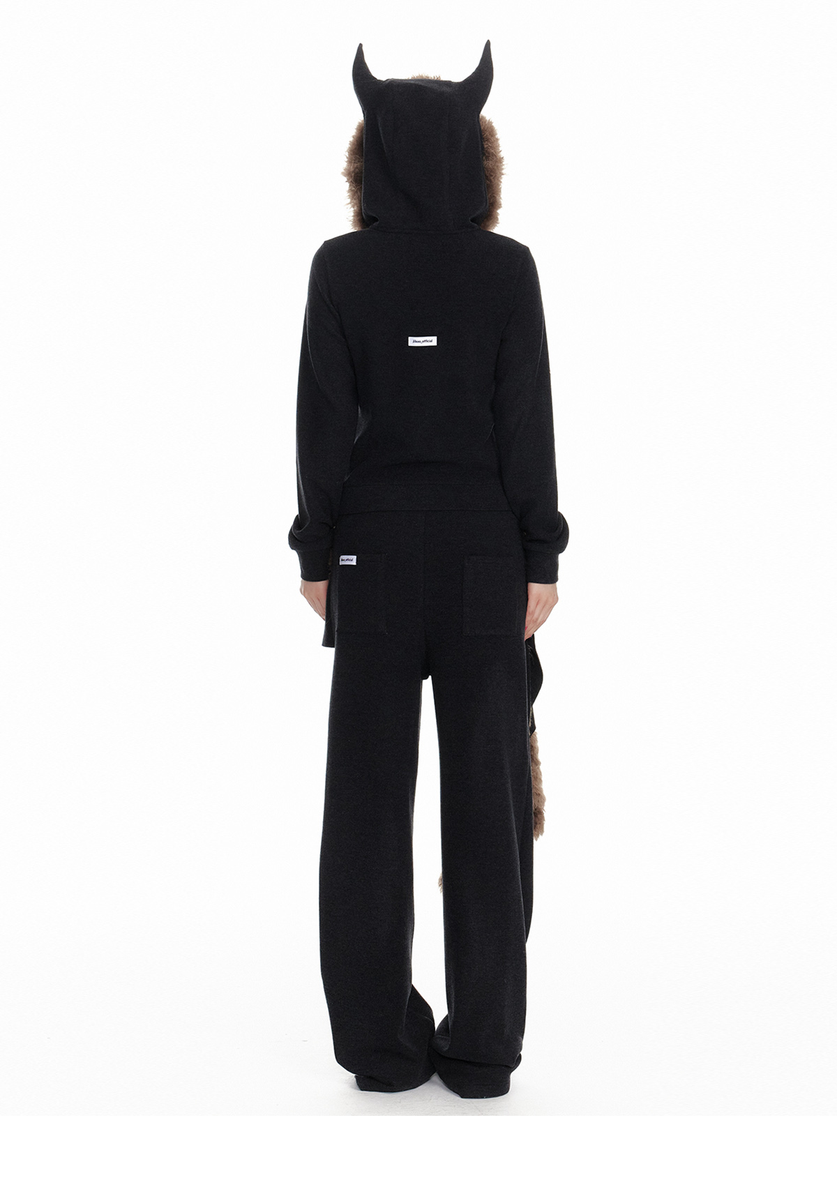 Horn Fur Collar Fuzzy Zipper Hoodie & Wide-Leg Pants Setup NA7102