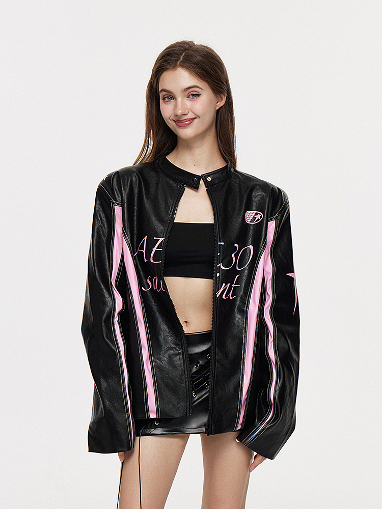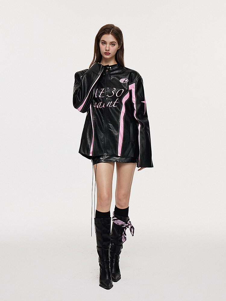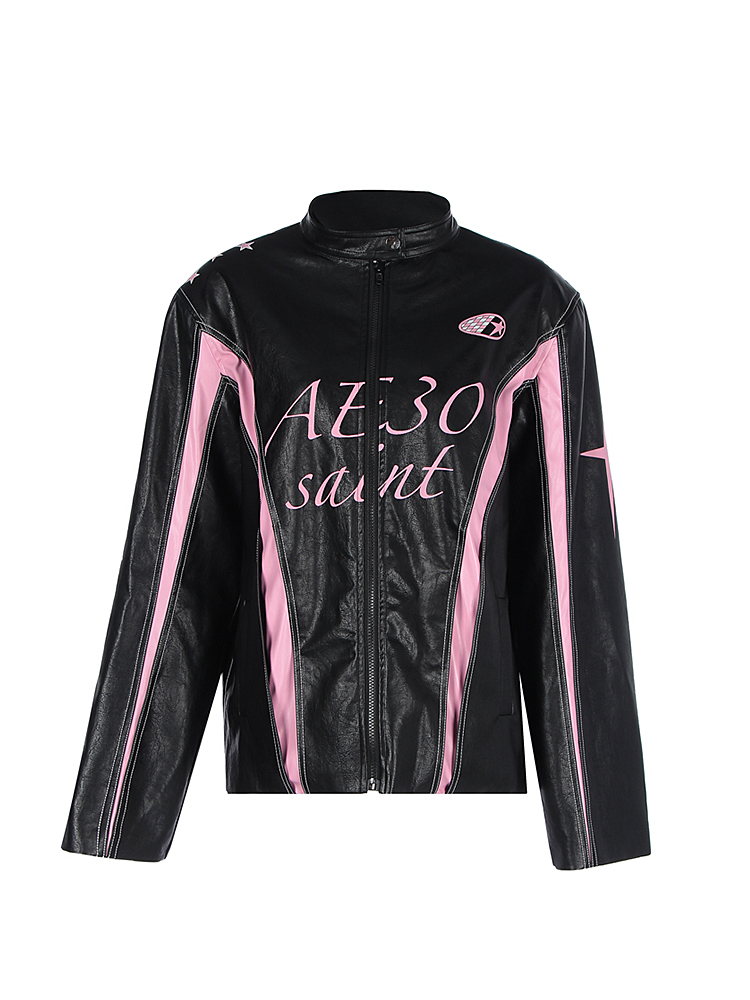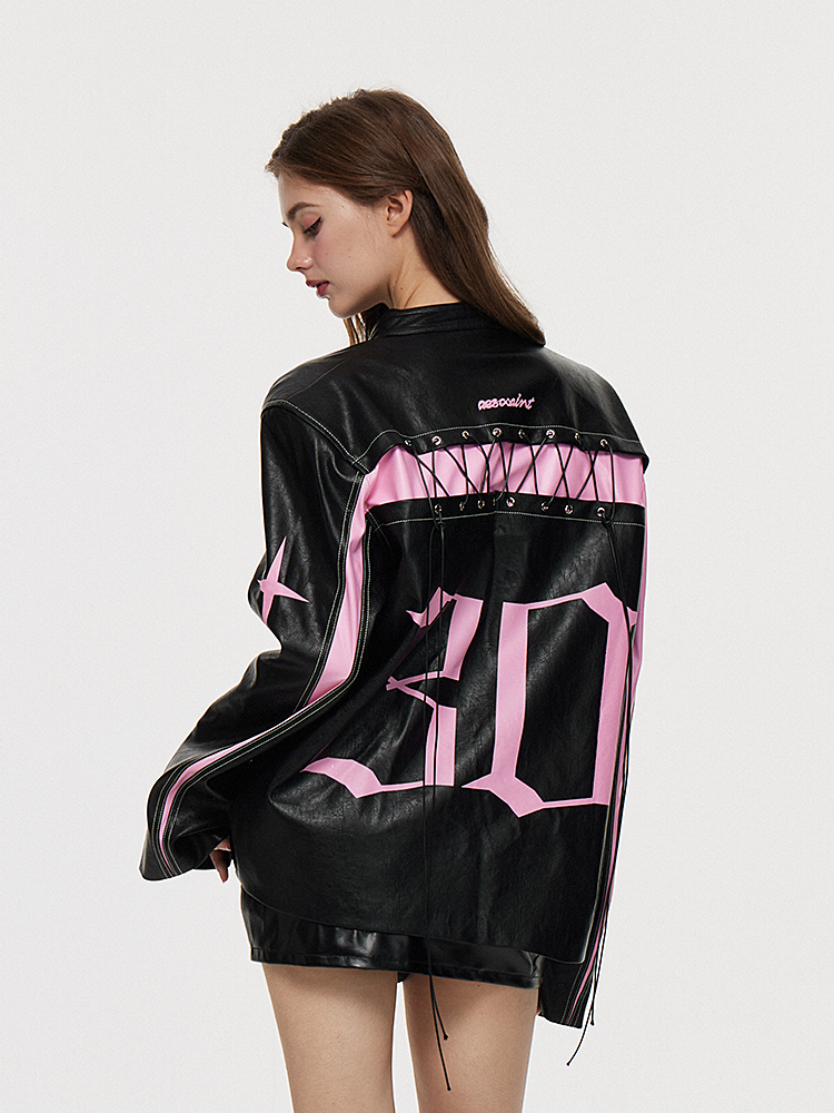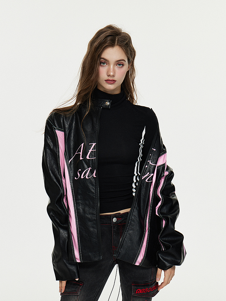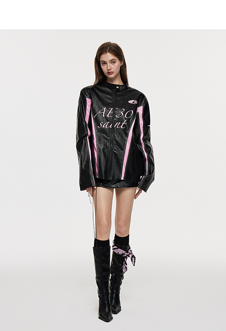 Patchwork Tie PU Leather Sporty Jacket NA7311