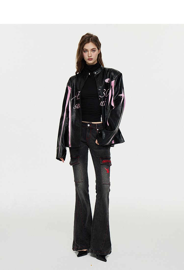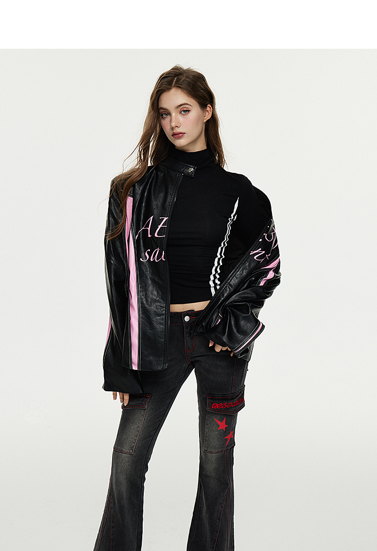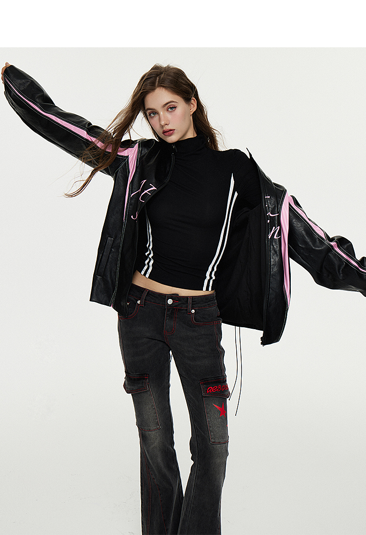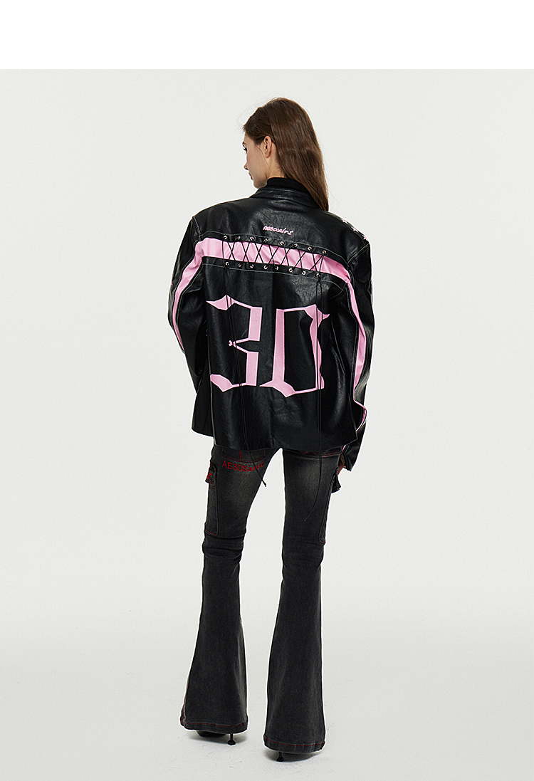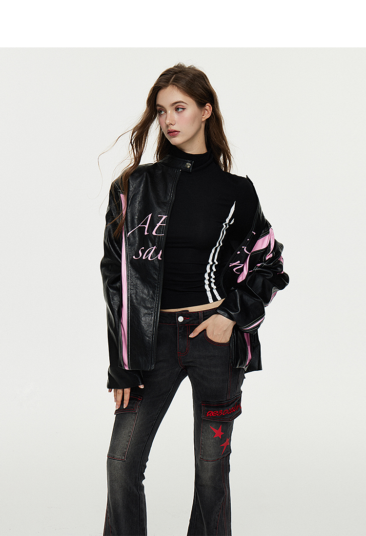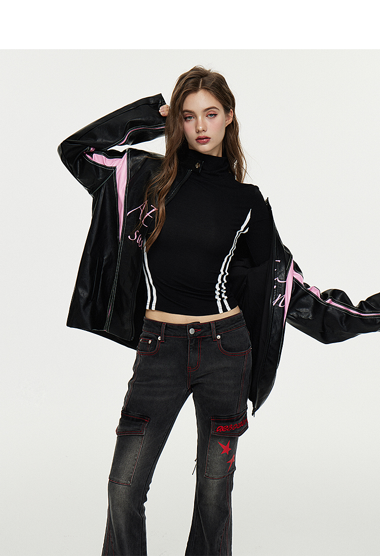 Patchwork Tie PU Leather Sporty Jacket NA7311