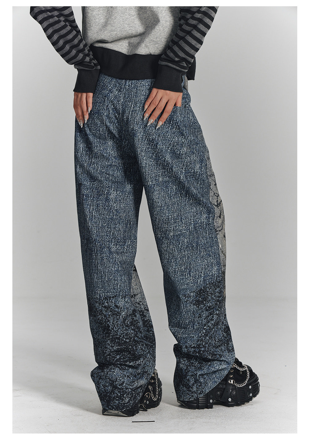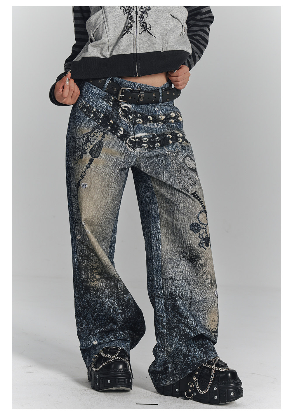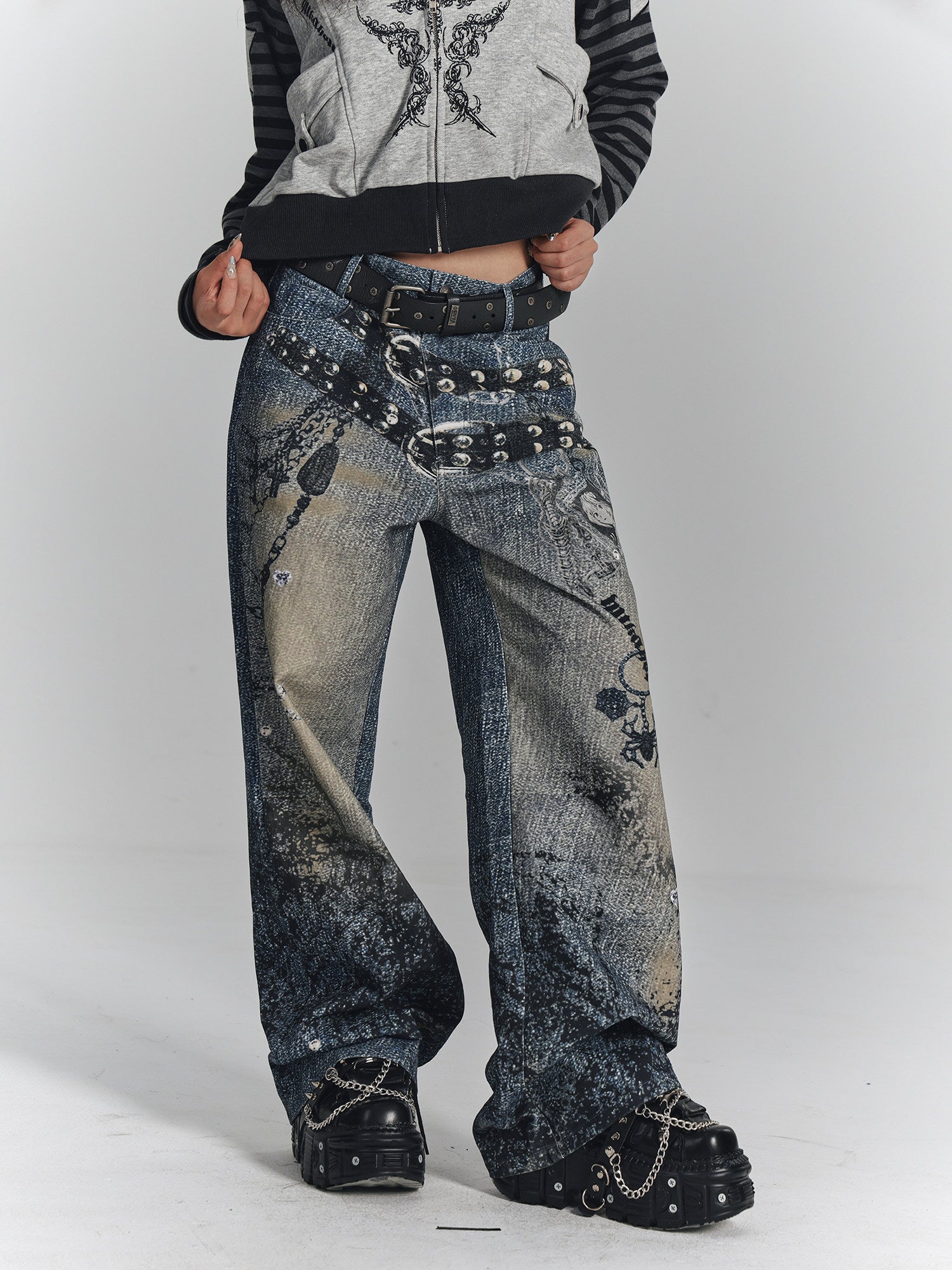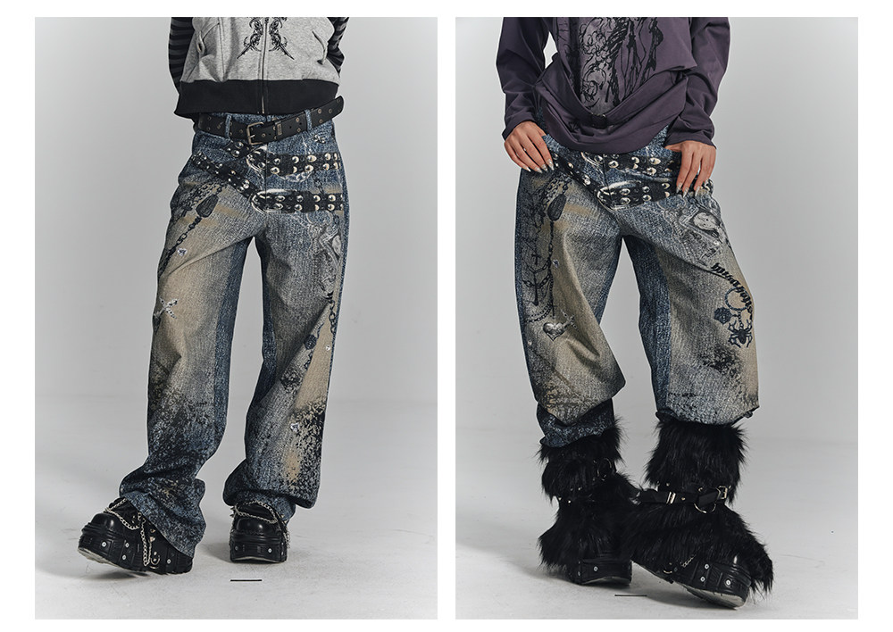 Chain Design Wide Leg Straight Denim Jeans NA8896