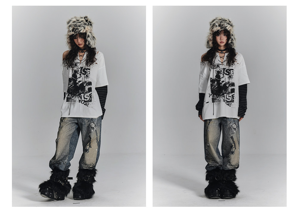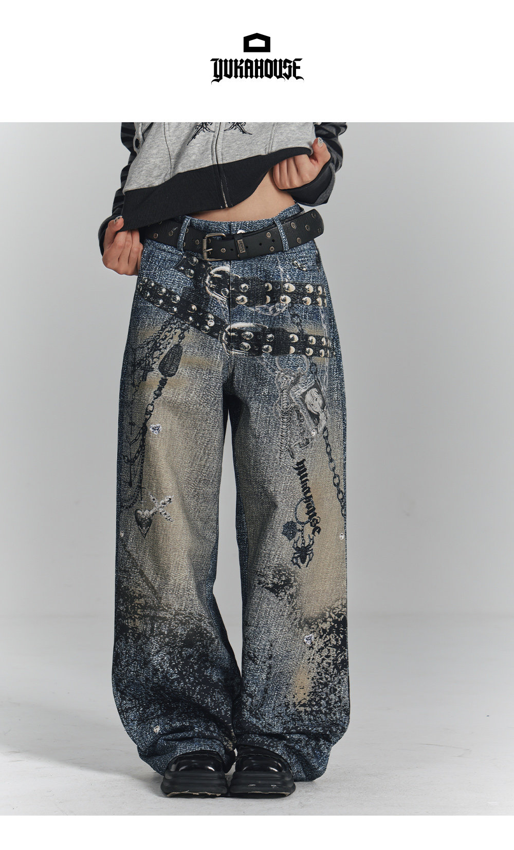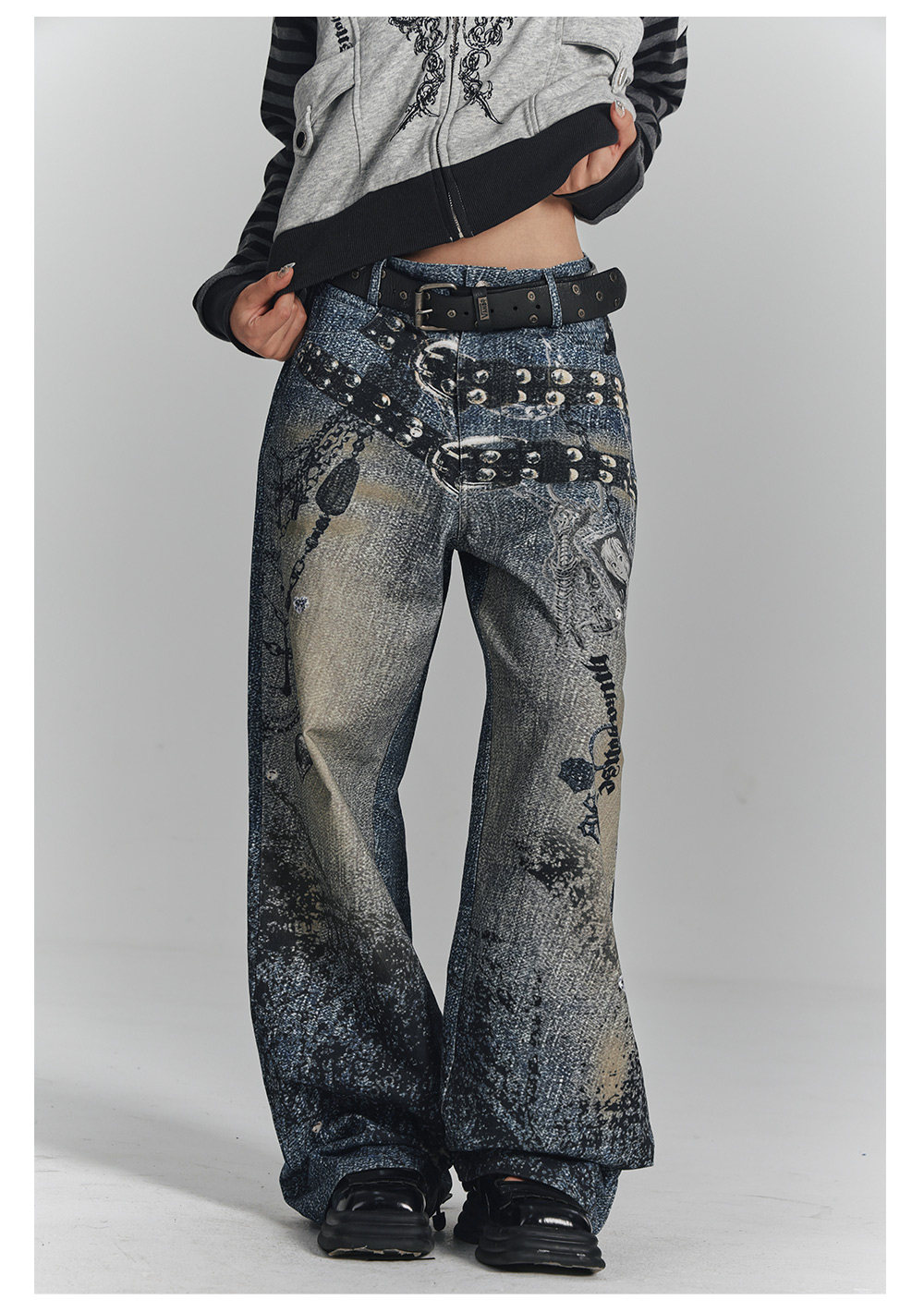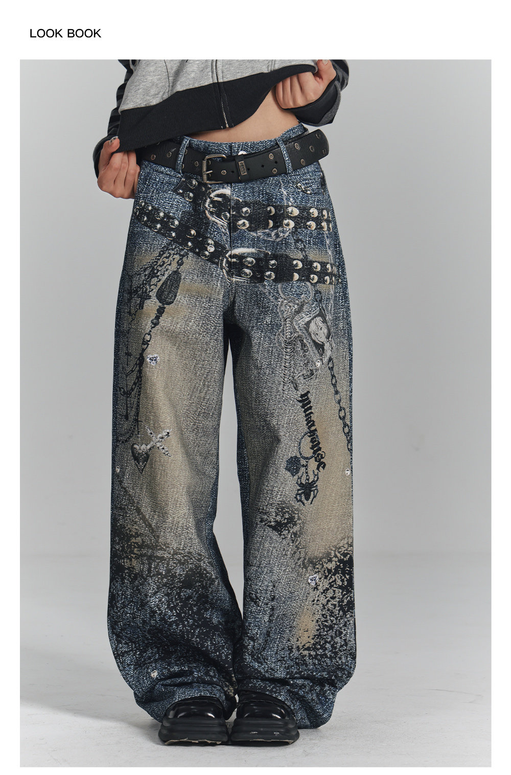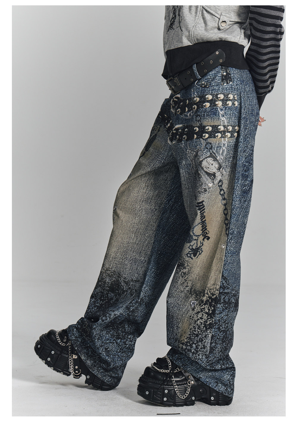 Chain Design Wide Leg Straight Denim Jeans NA8896