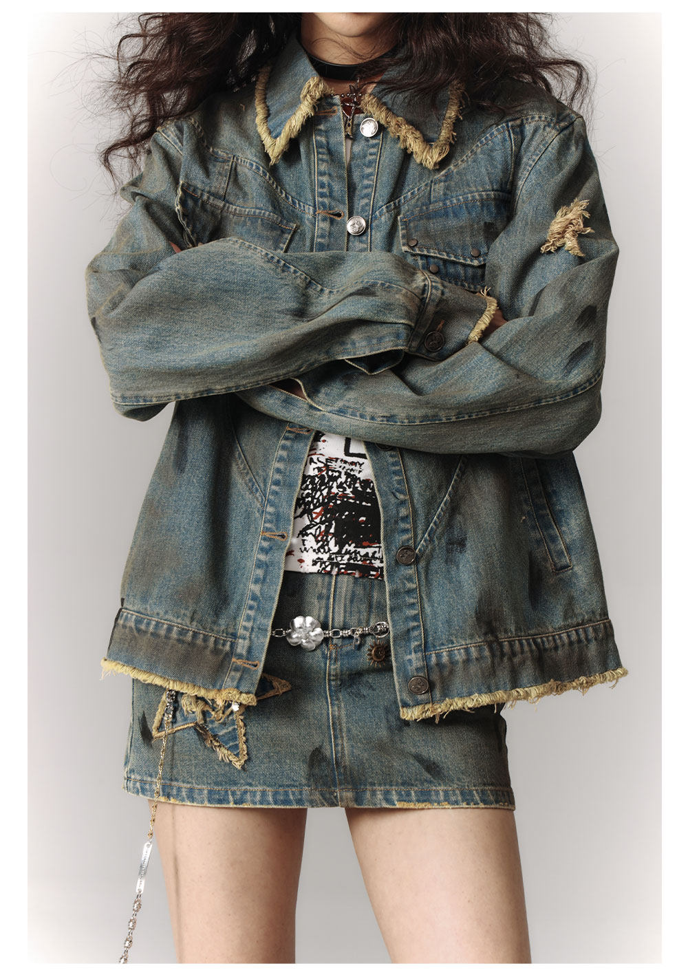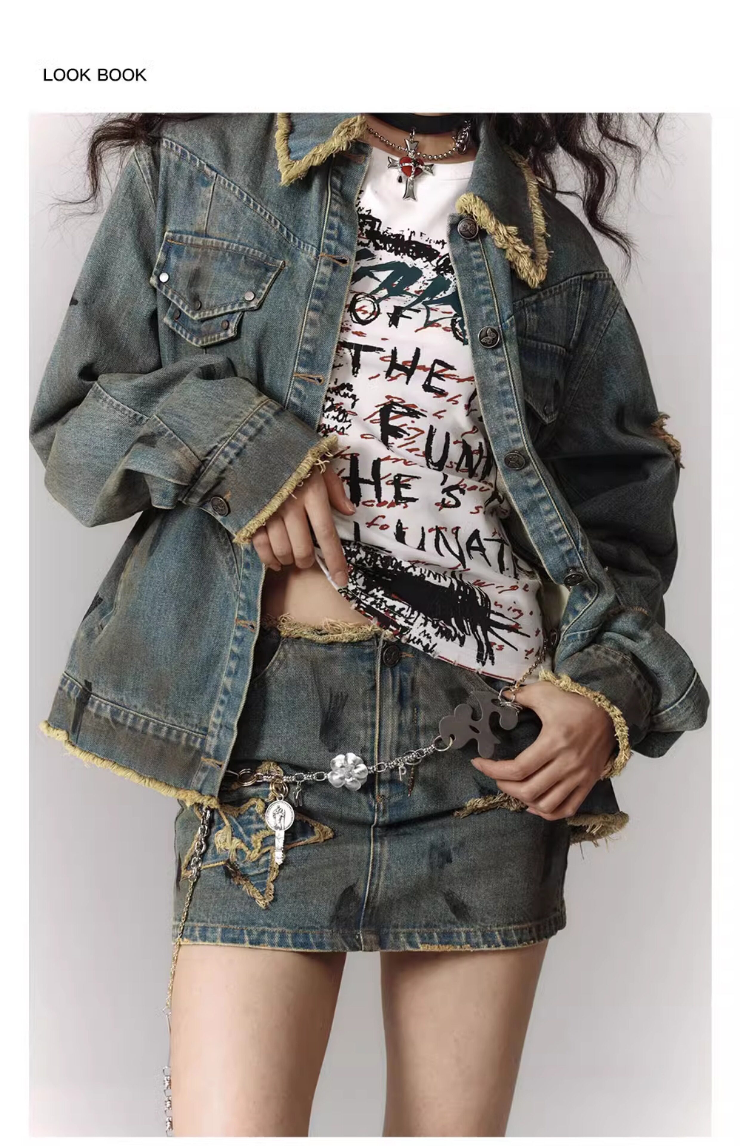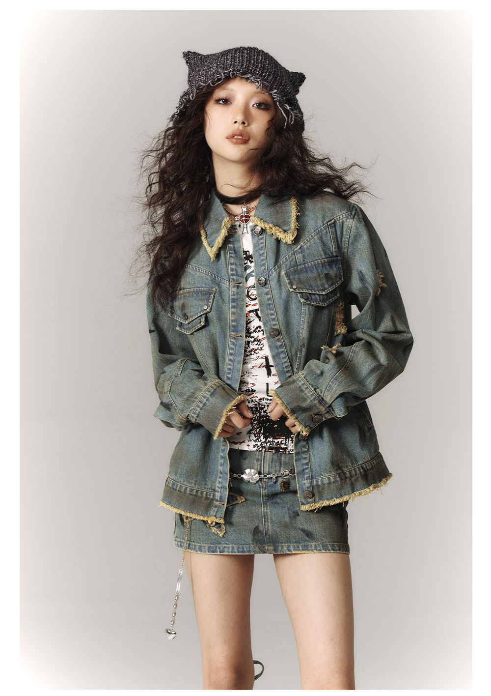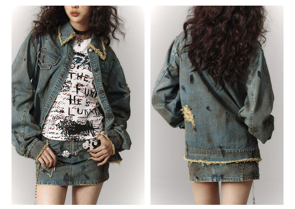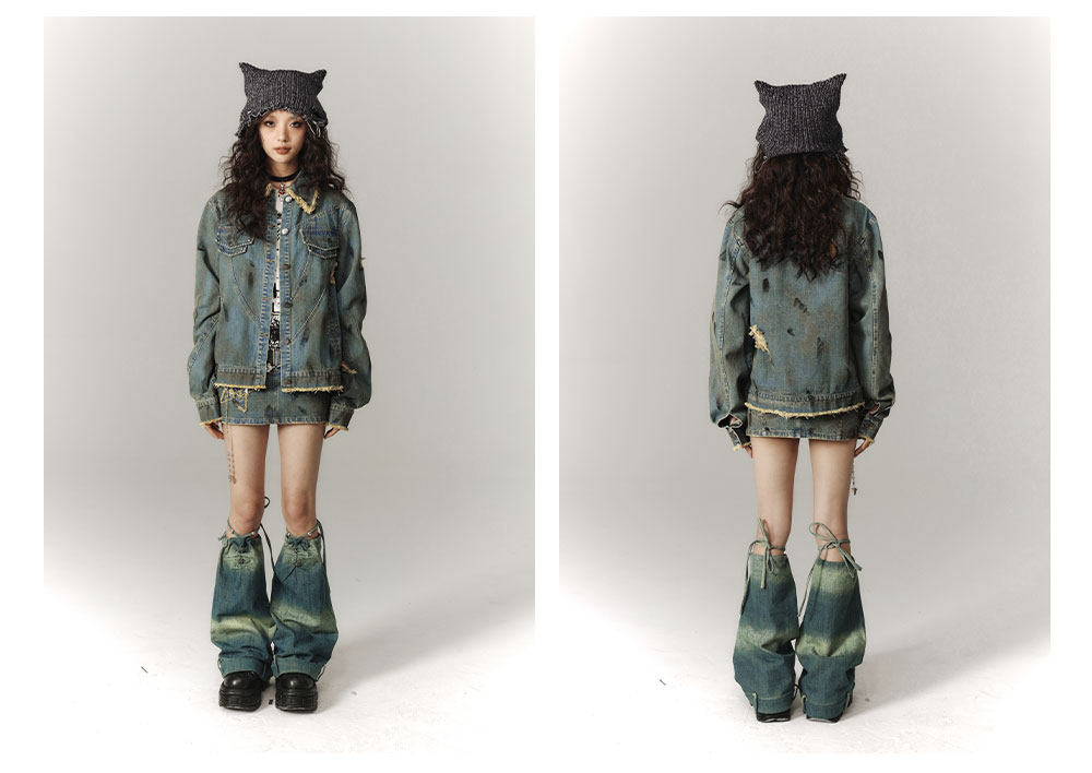 Washed Frayed Collar Denim Jacket & Denim Short Skirt Setup NA8915