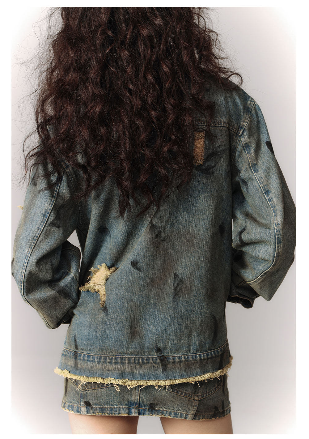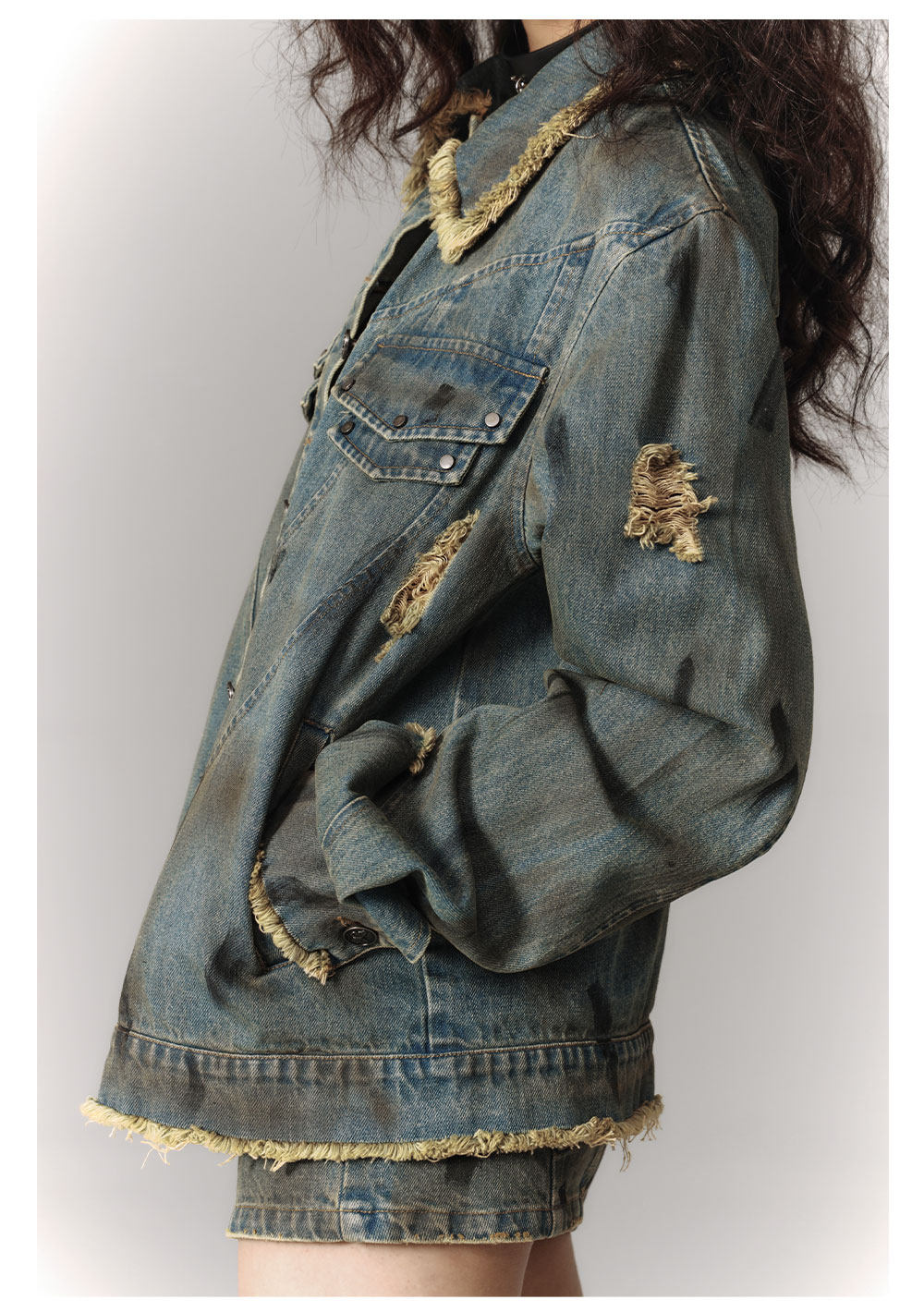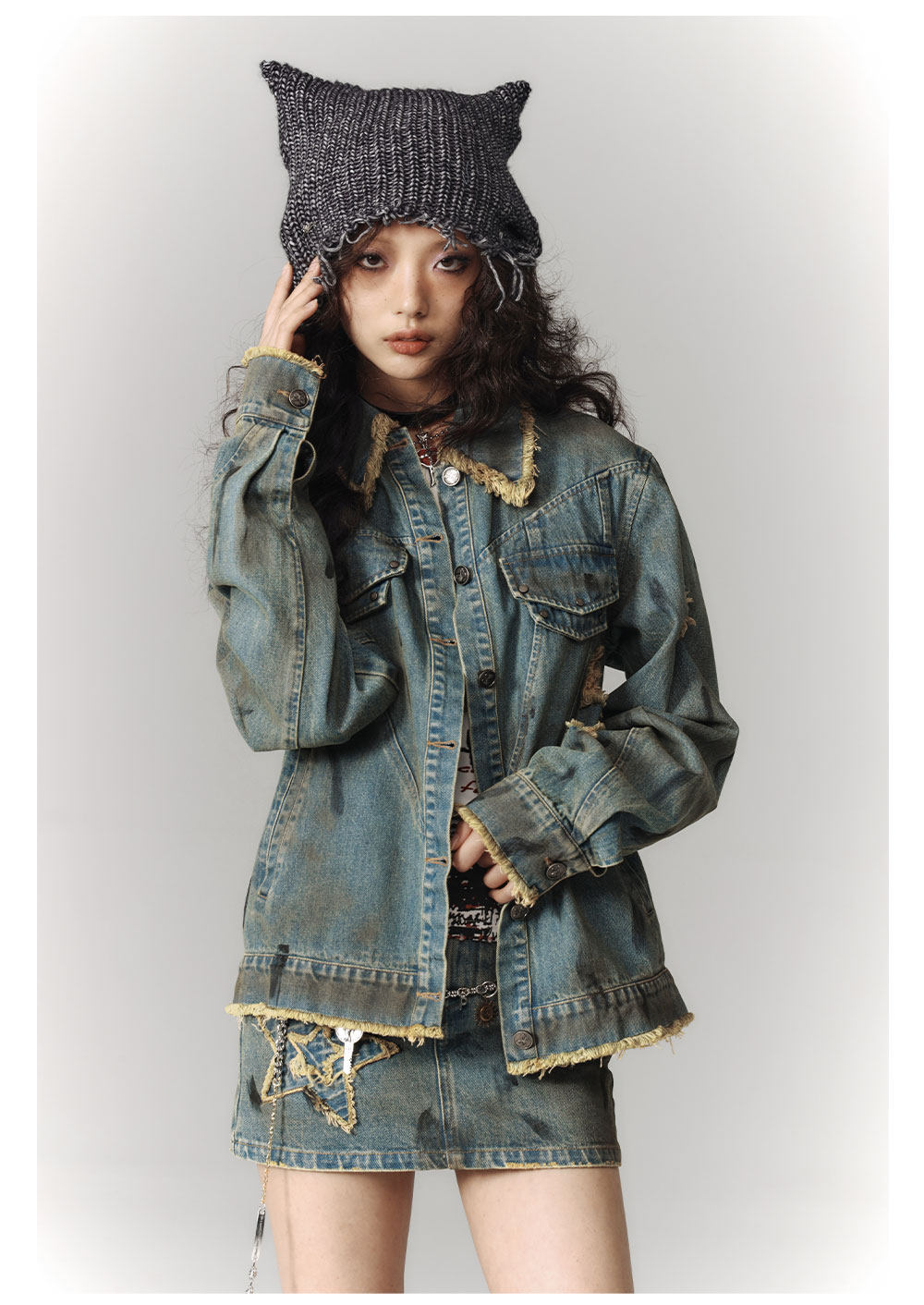 Washed Frayed Collar Denim Jacket & Denim Short Skirt Setup NA8915