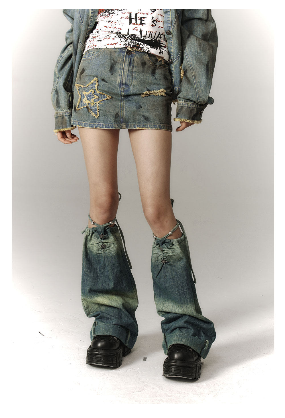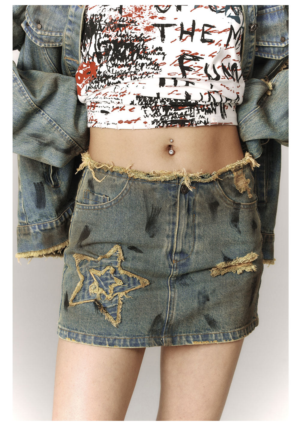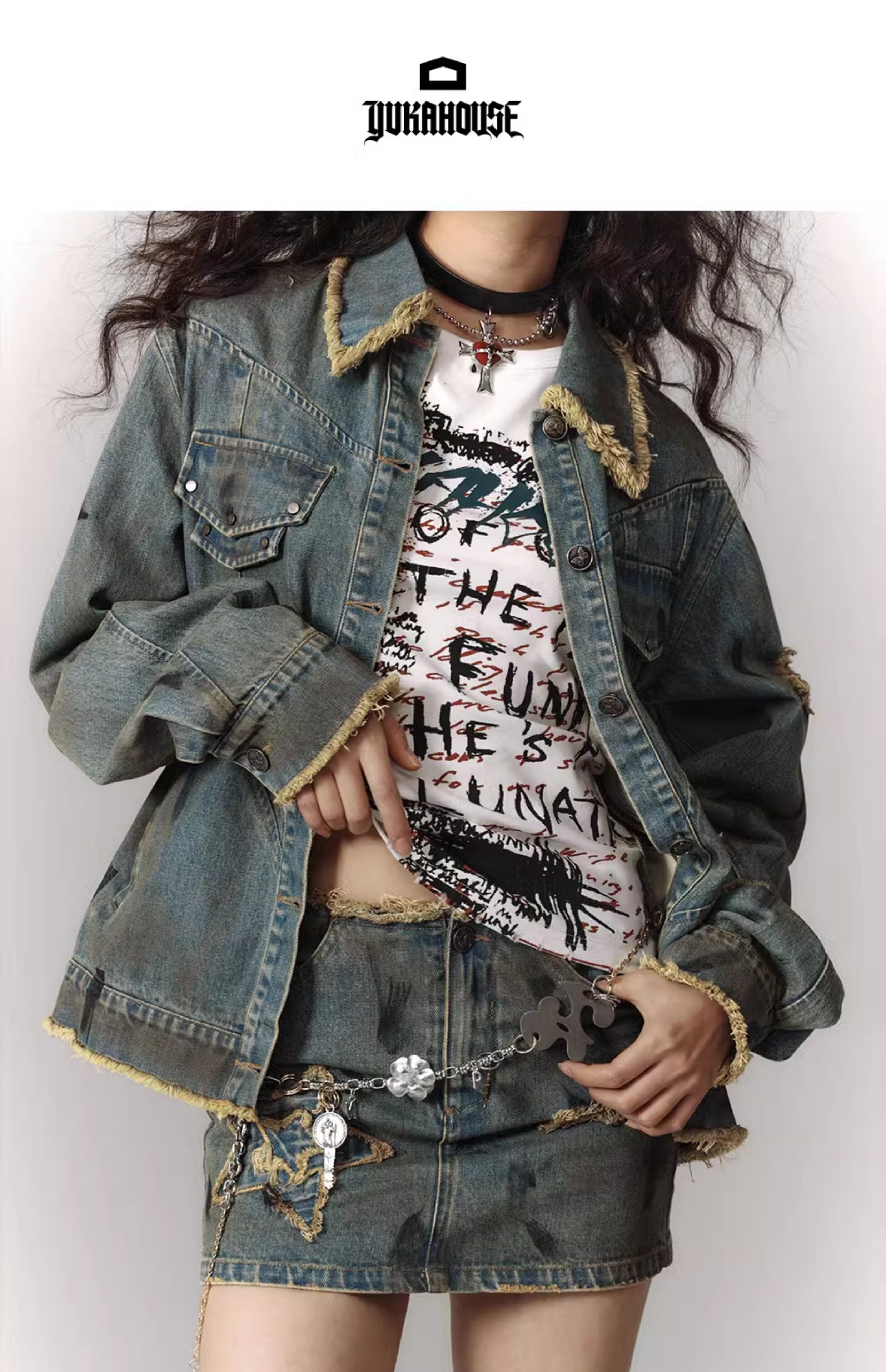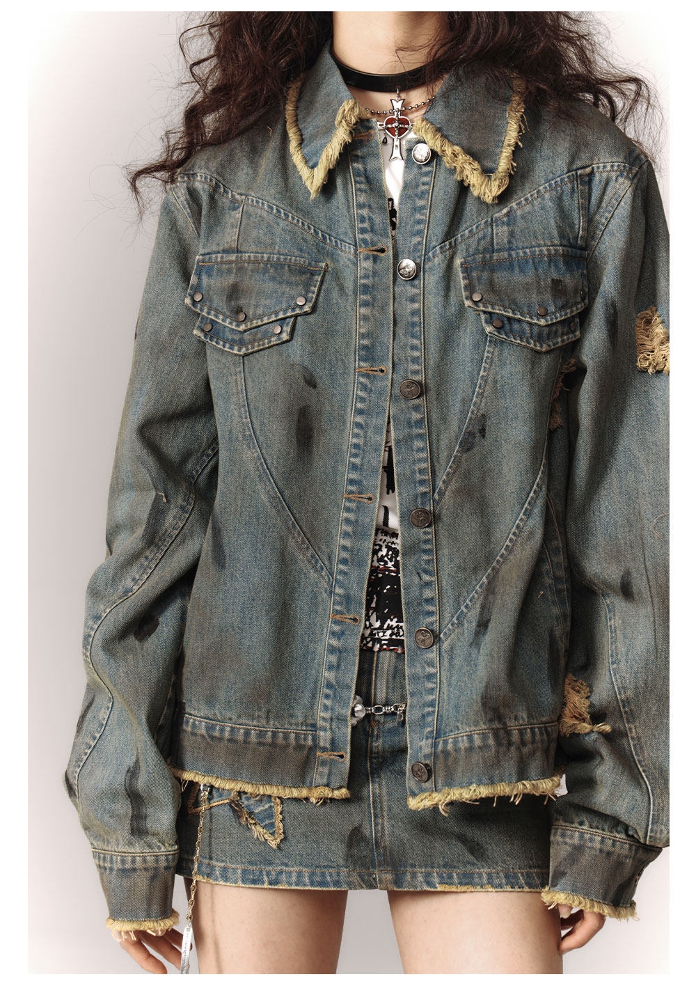 Washed Frayed Collar Denim Jacket & Denim Short Skirt Setup NA8915
