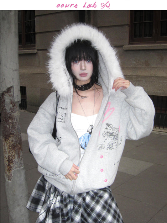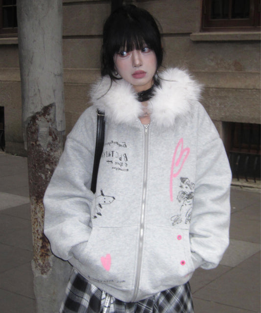 Detachable Fake Fur Collar Graffiti Print Sweatshirt Jacket NA8216