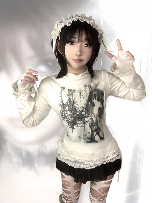 Gothic Emo Girl Fake Layered Lace-Trim Long Sleeve T-Shirt NA7633