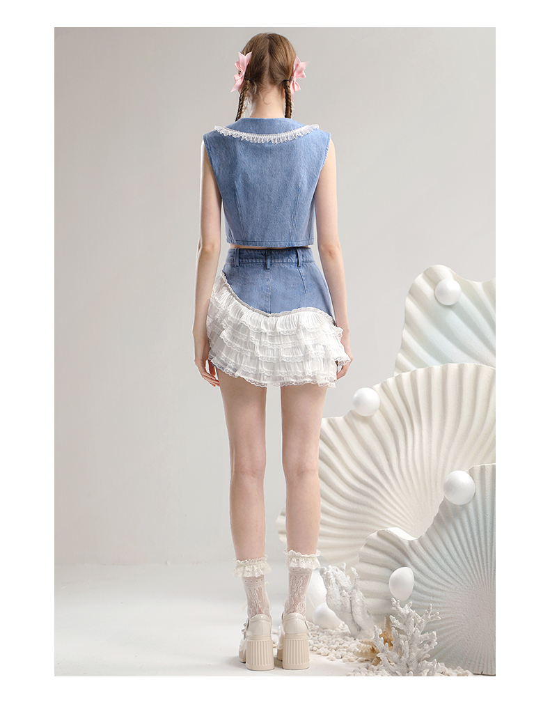 Waist UP Sleeveless Denim Shirt & Asymmetry Patchwork Short Skirt Setup NA 5469