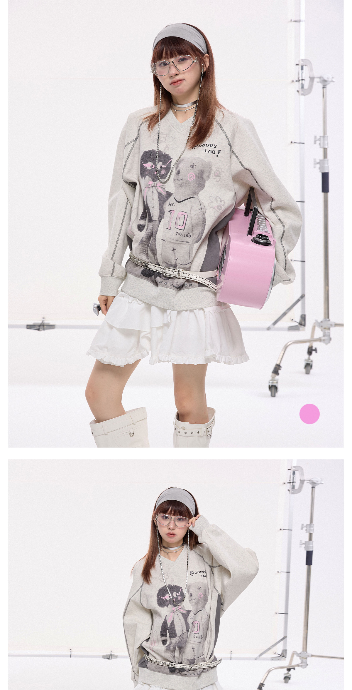 V-Neck Oversize Pullover Bear Graphic Sweatshirt & Ruffle Skirt Setup NA8212