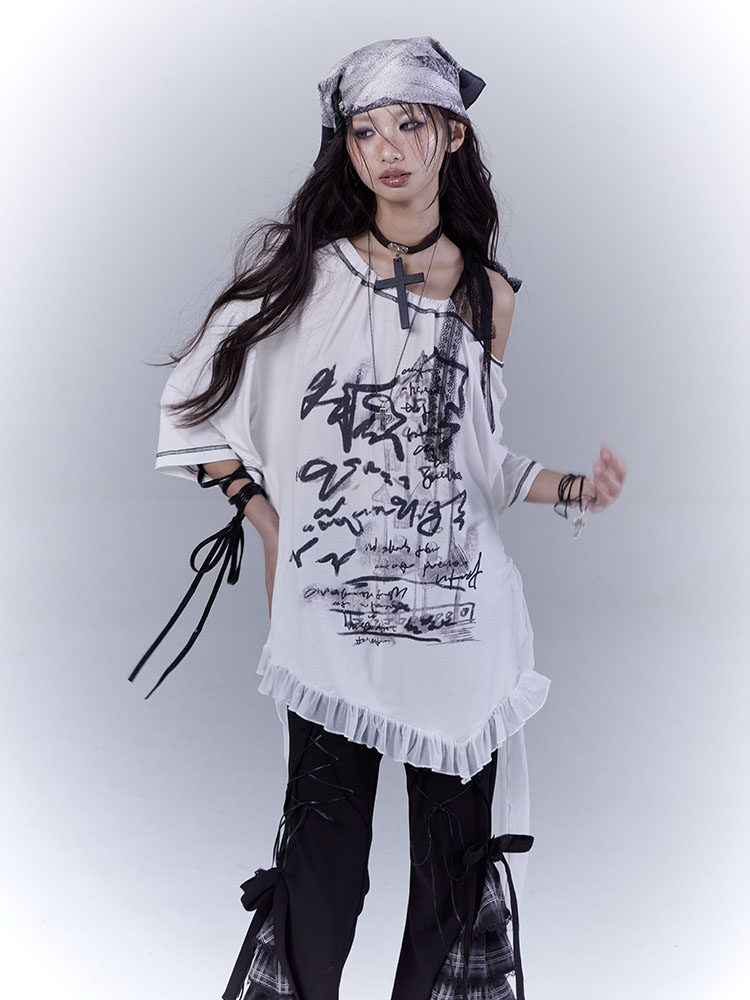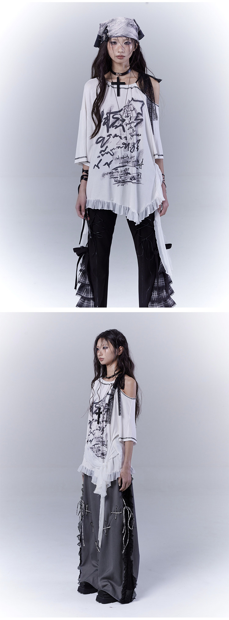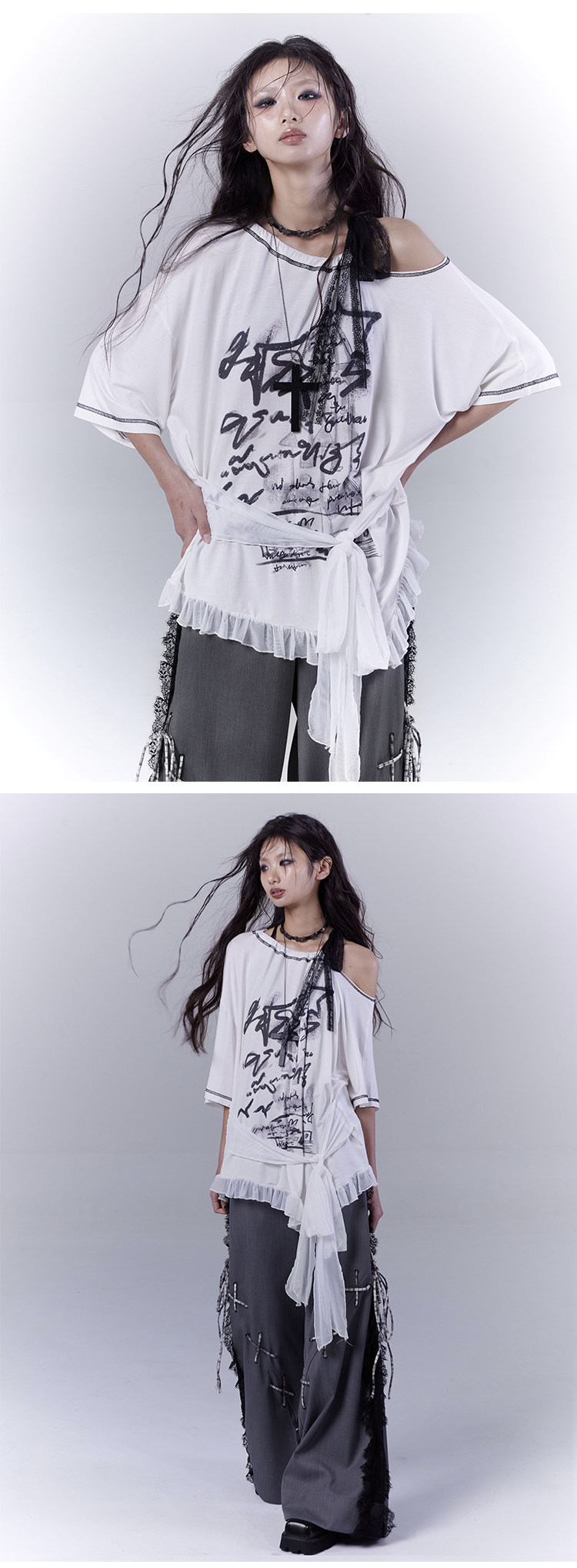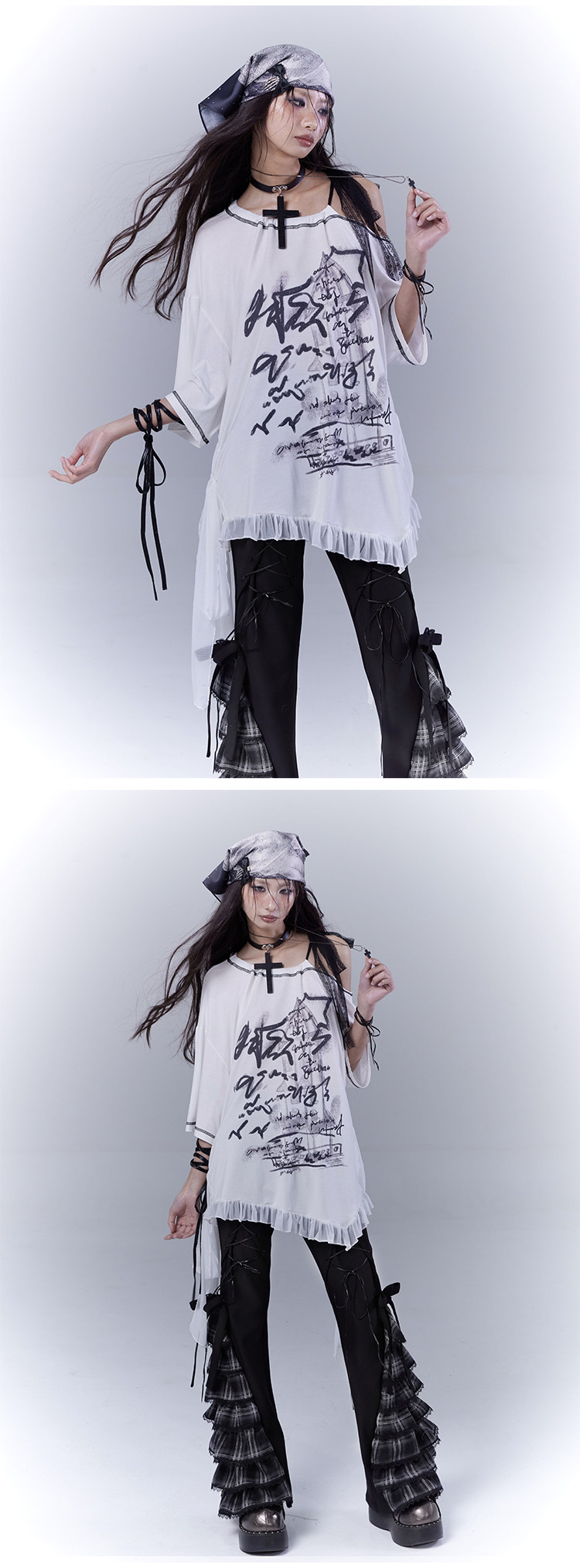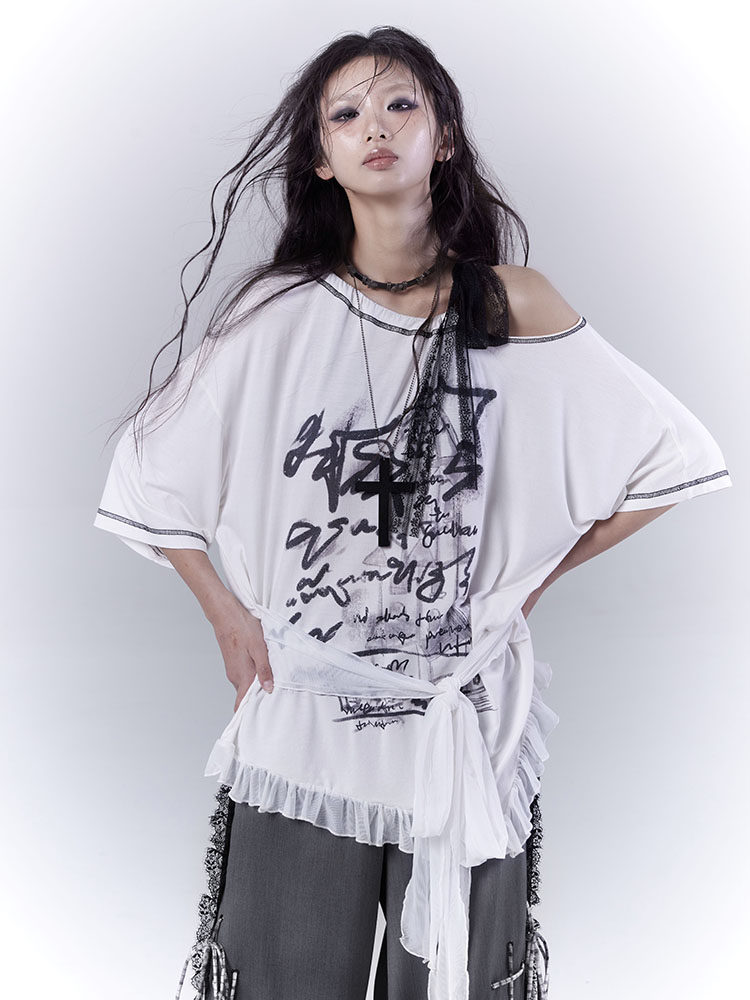 Design Print Sheer Oversize Short Sleeve T-Shirt NA8536